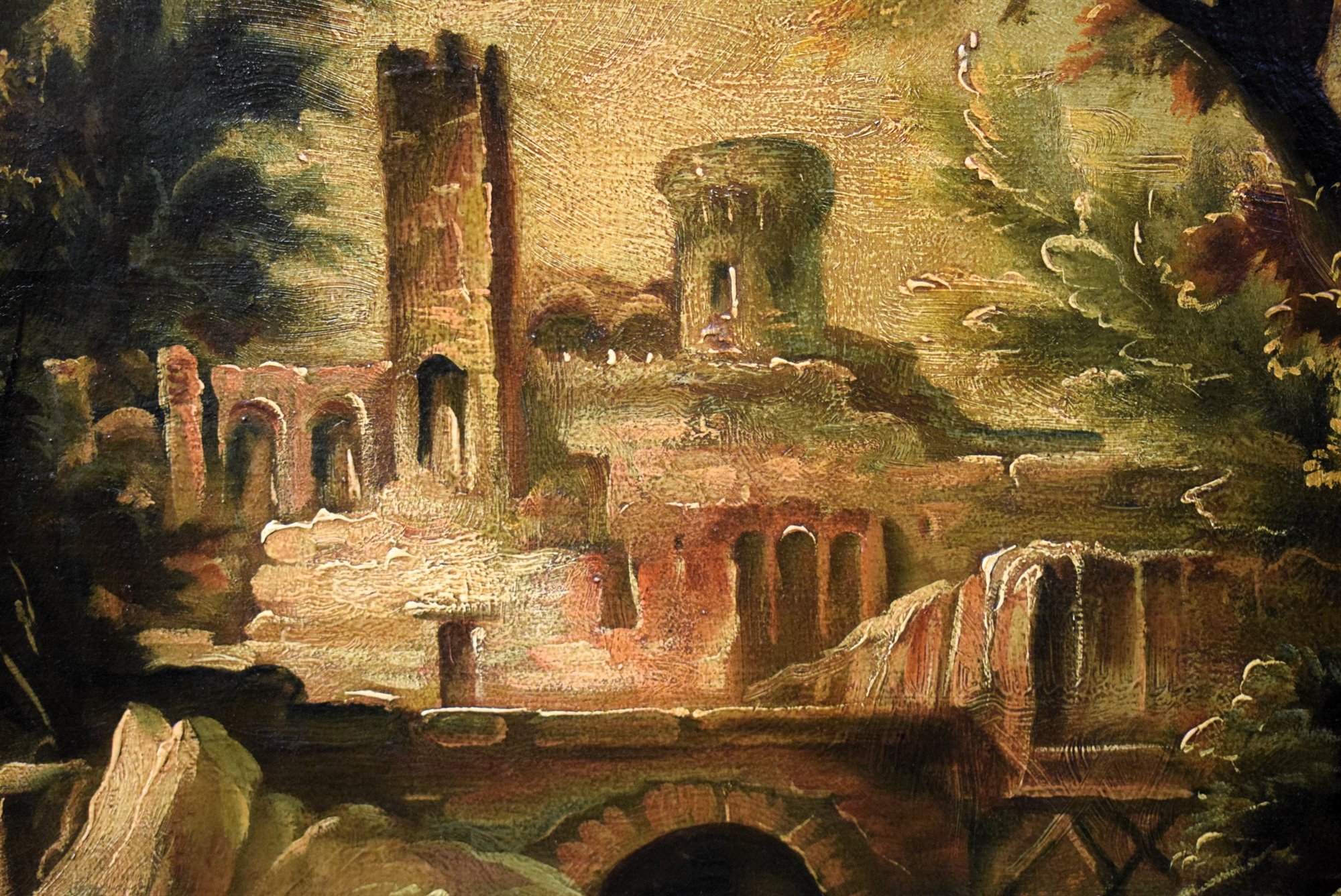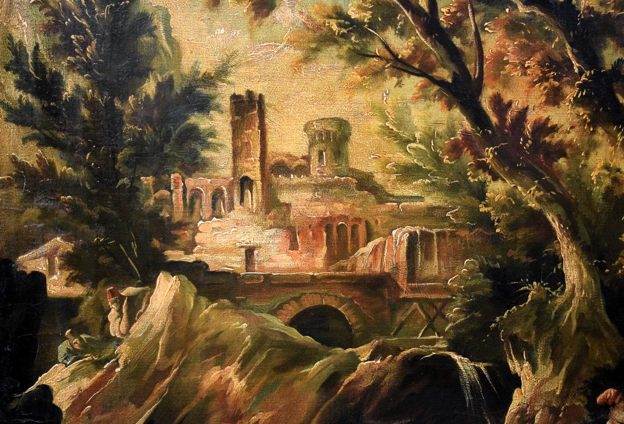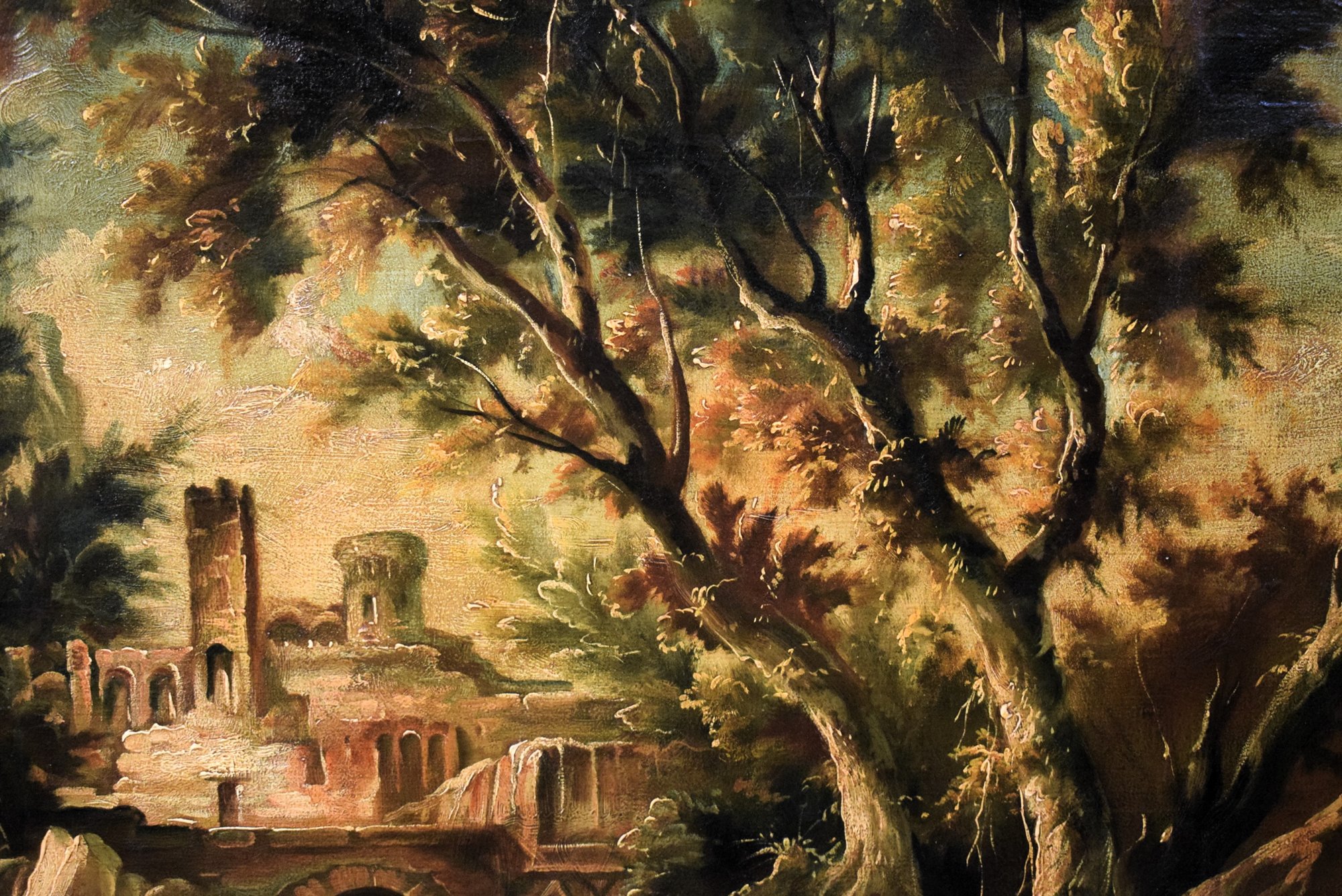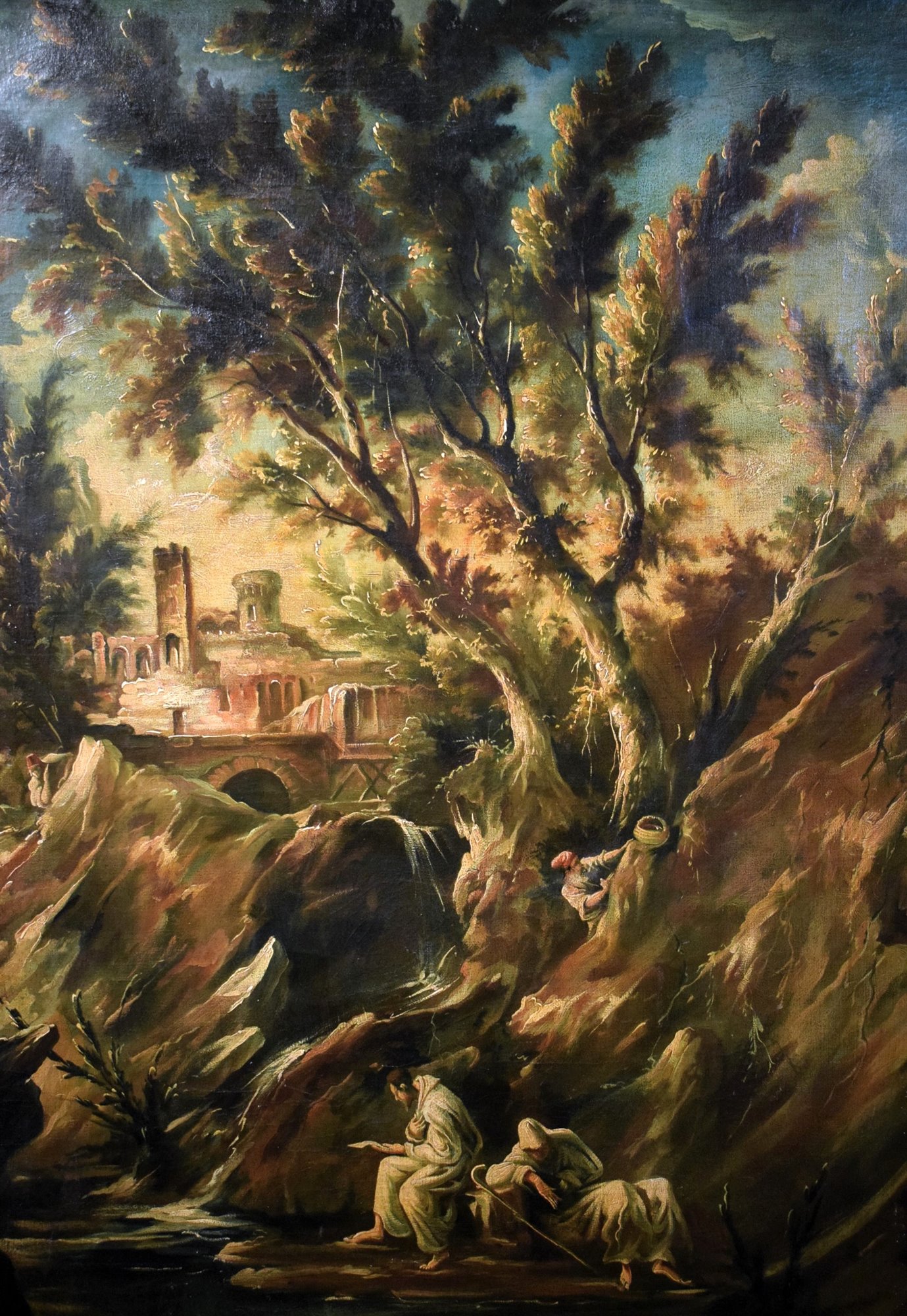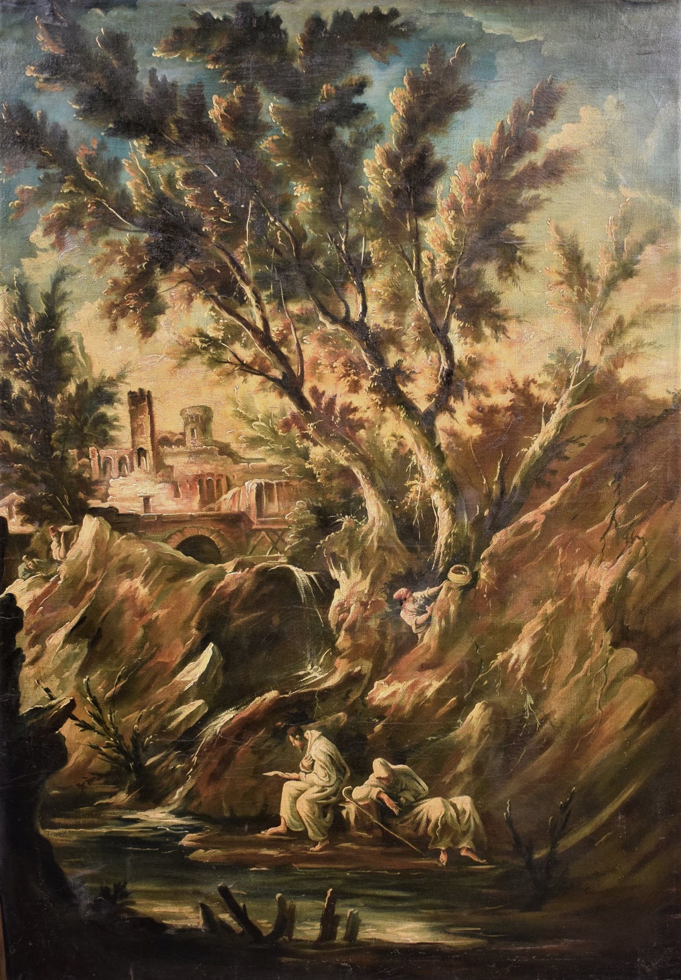 This fascinating painting depicting a Fantastic Landscape, presents all the pictorial characteristics of the famous Genoese artist Alessandro Magnasco, called Lissandrino for his short stature. According to the typical dictates of his landscape painting, it is set in a forest with fairy-tale tones but veiled dark and disturbing. Strange characters, described with unmistakable features, wander in the woods while two inevitable friars rest in the cool on the bank of a stream. Illuminated by a sliver of light between the branches of the trees, a ruined castle on a cliff.