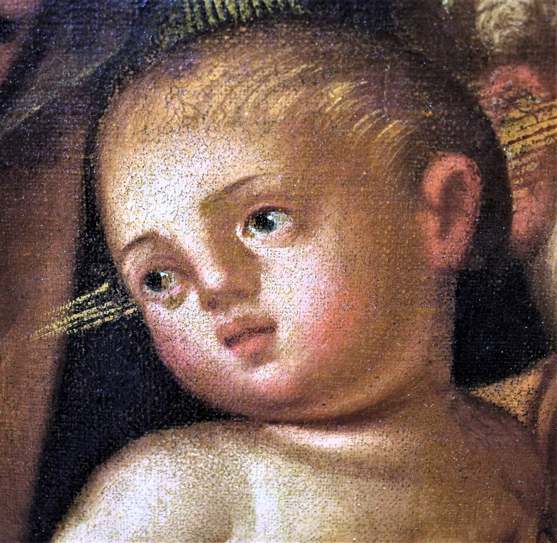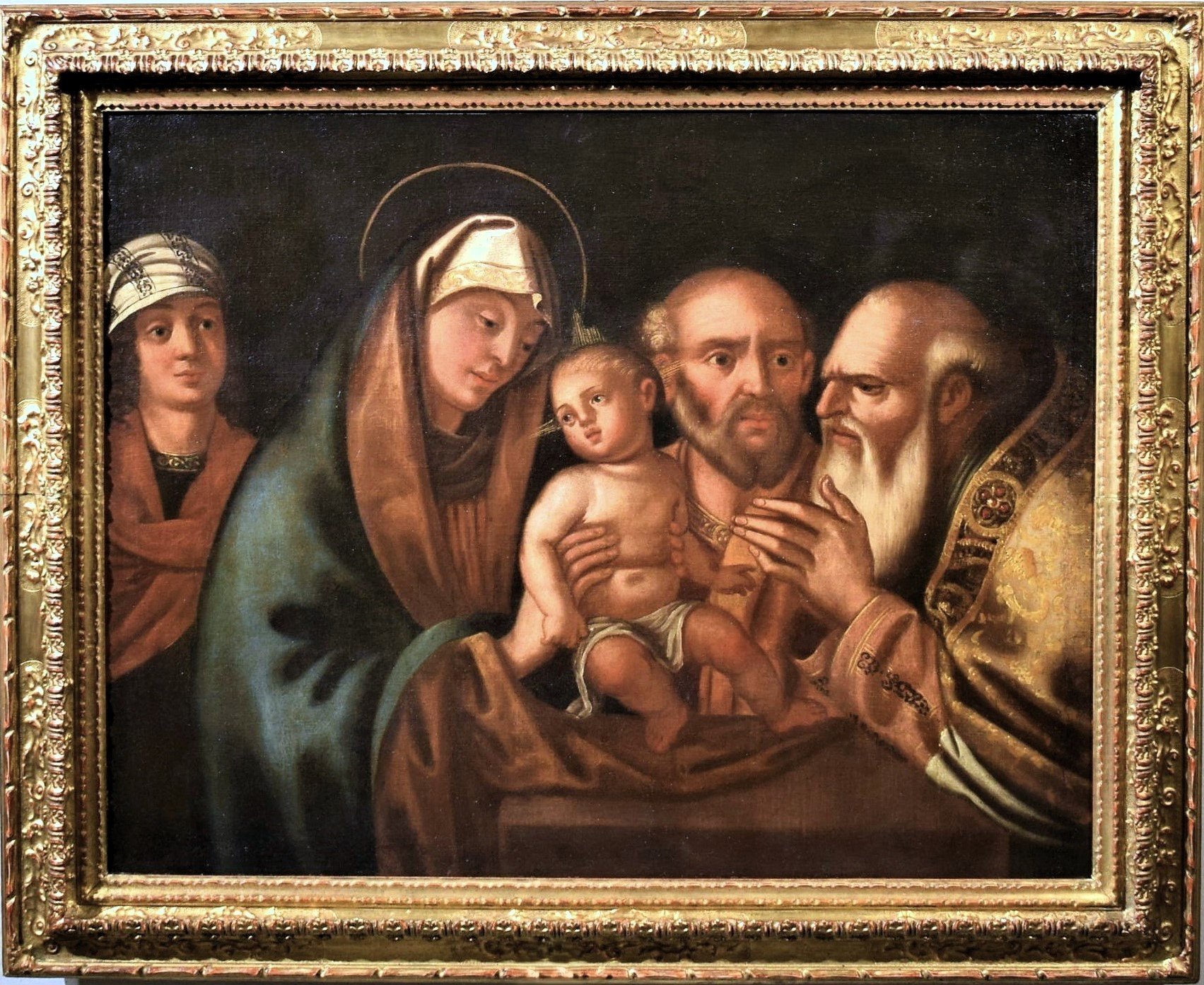 This elegant, typically sixteenth-century composition describes the episode from the Gospel of Saint Luke, which sees the little Jesus presented in the Temple of Jerusalem. The scene is truly attractive: the Virgin lifts her Son with two hands and offers him to Simeon. While a bewildered Joseph stares wide-eyed at the severe figure of the bearded old man, the Child withdraws in fear, turning towards the Mother who tenderly observes him protectively. Not far from the group, a young woman participates in the solemn ritual, who tradition indicates as the midwife who helped Mary during her birth. The work is of excellent workmanship and has the unmistakable characteristics of Venetian painting of the 16th century. The references to the famous compositions of Giovanni Bellini are evident, who with his extraordinary pictorial language influenced all the Venetian artists of the 16th century. The palette used is characterized by exclusively warm colors in yellow, ocher and brown shades, with the sole exception of the blue cloak of the Virgin. The work has already been cleaned and perfectly relined and is in excellent condition. It is complete with a beautiful carved and gilded frame.