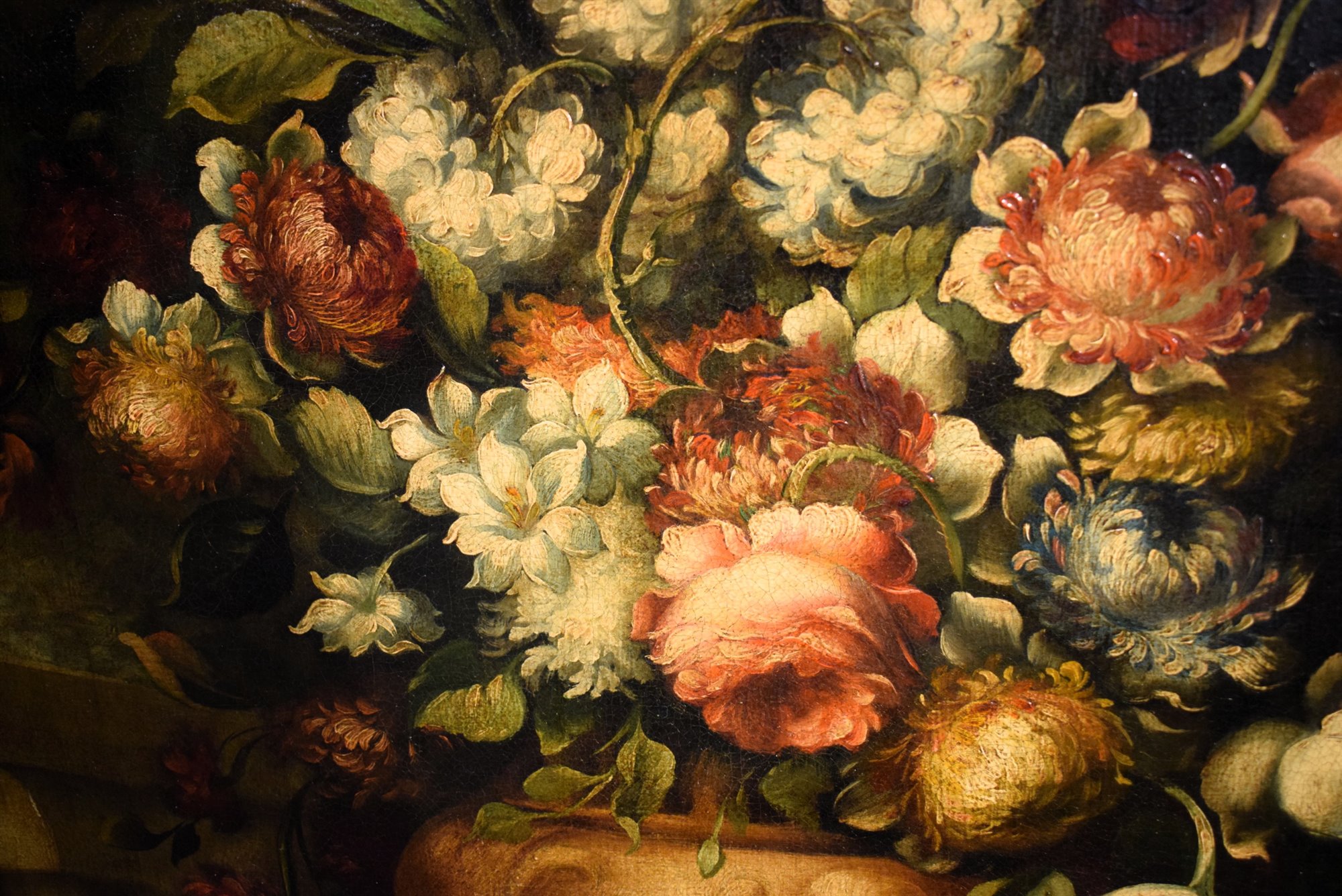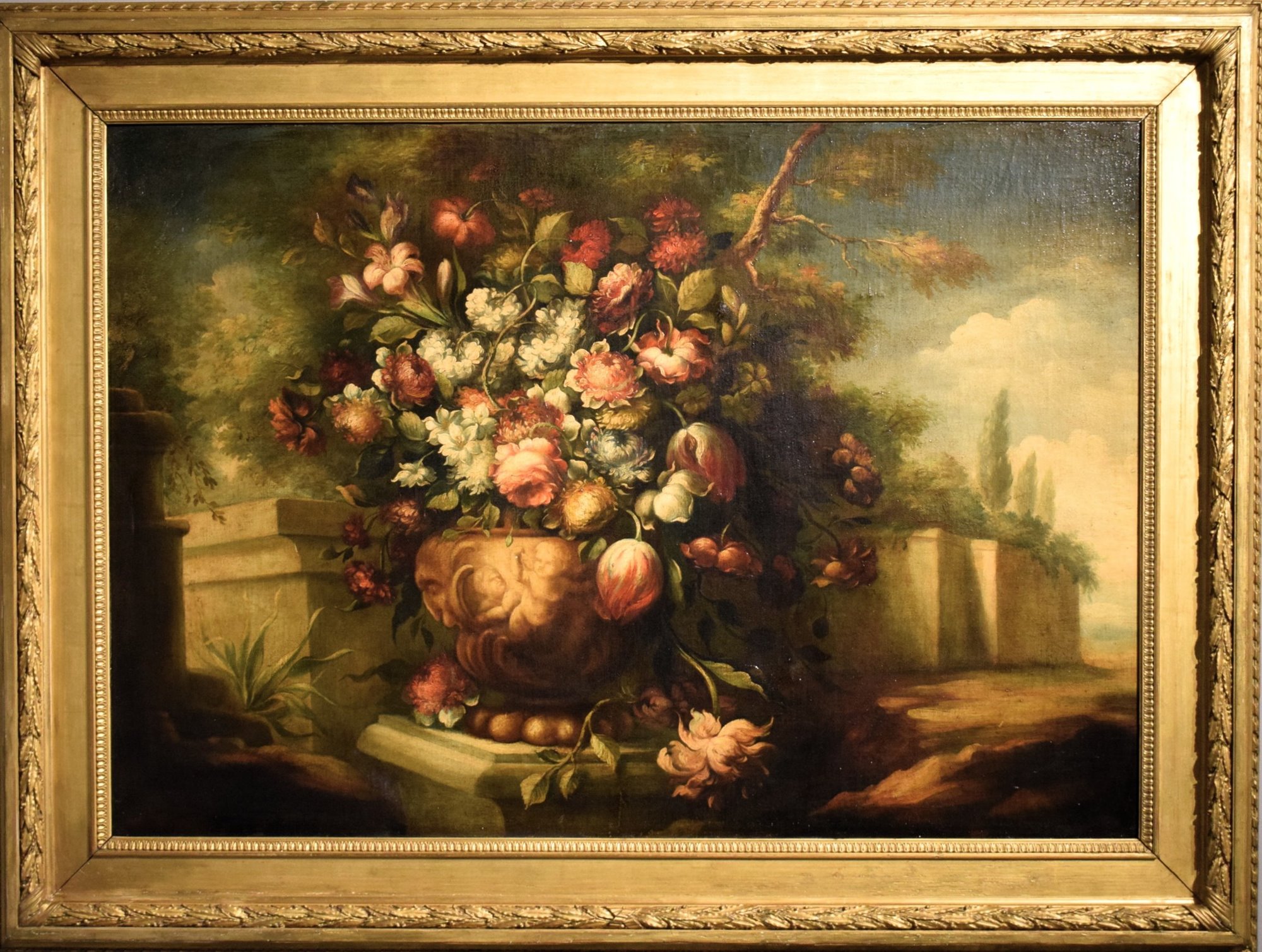 The majestic floral composition is contained in a Medici vase decorated with cherubs and masks.