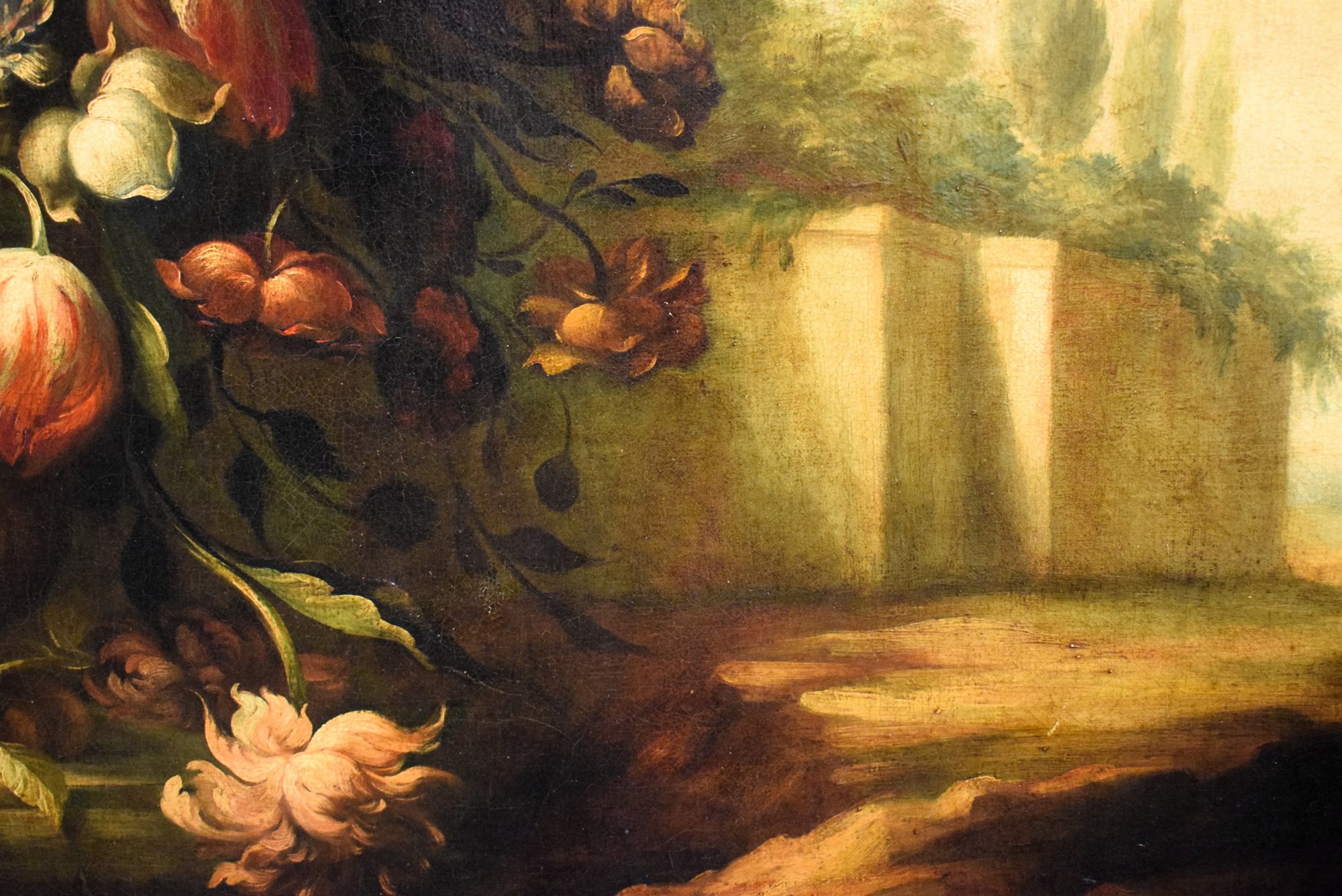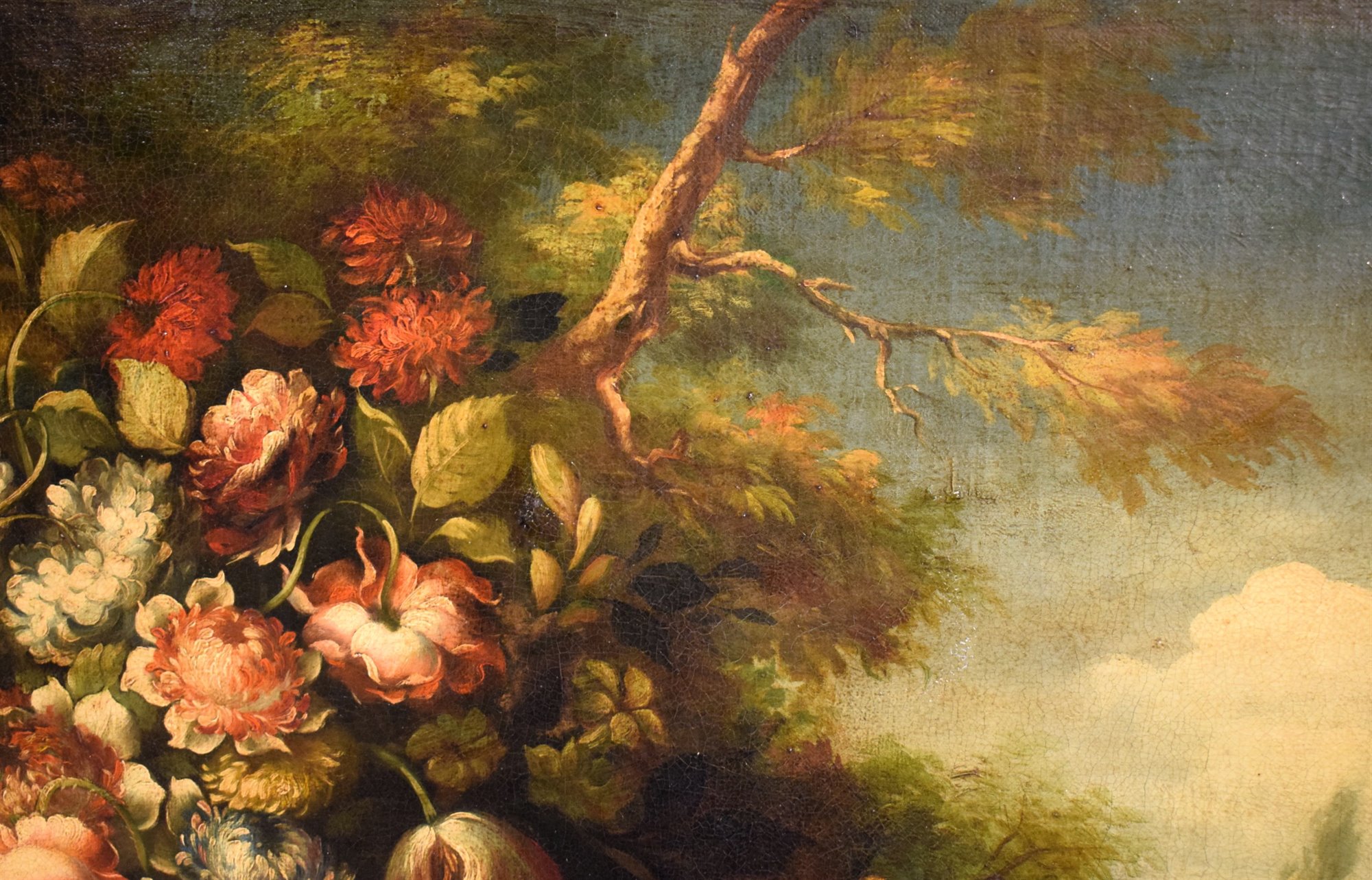 The painting depicts an imposing display of flowers displayed outdoors in a wooded landscape.