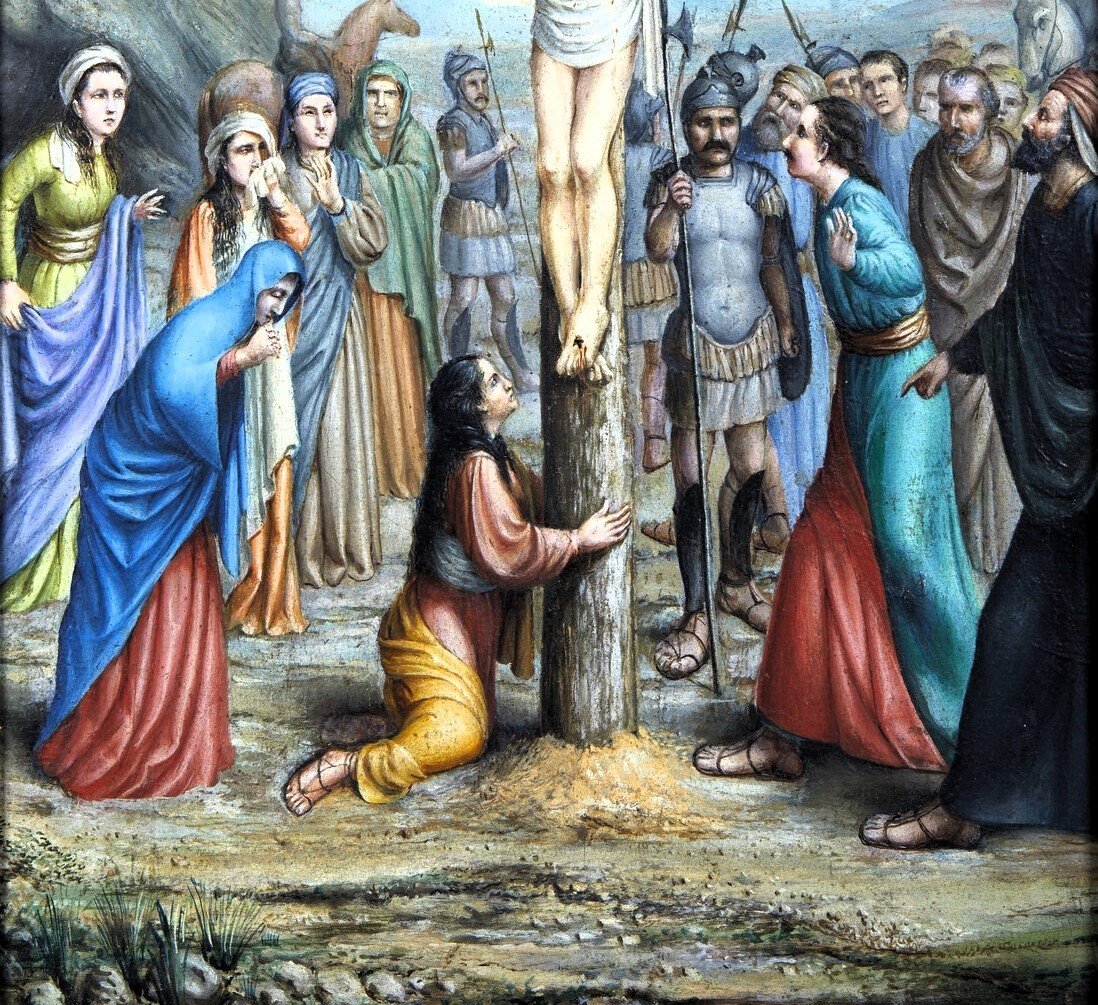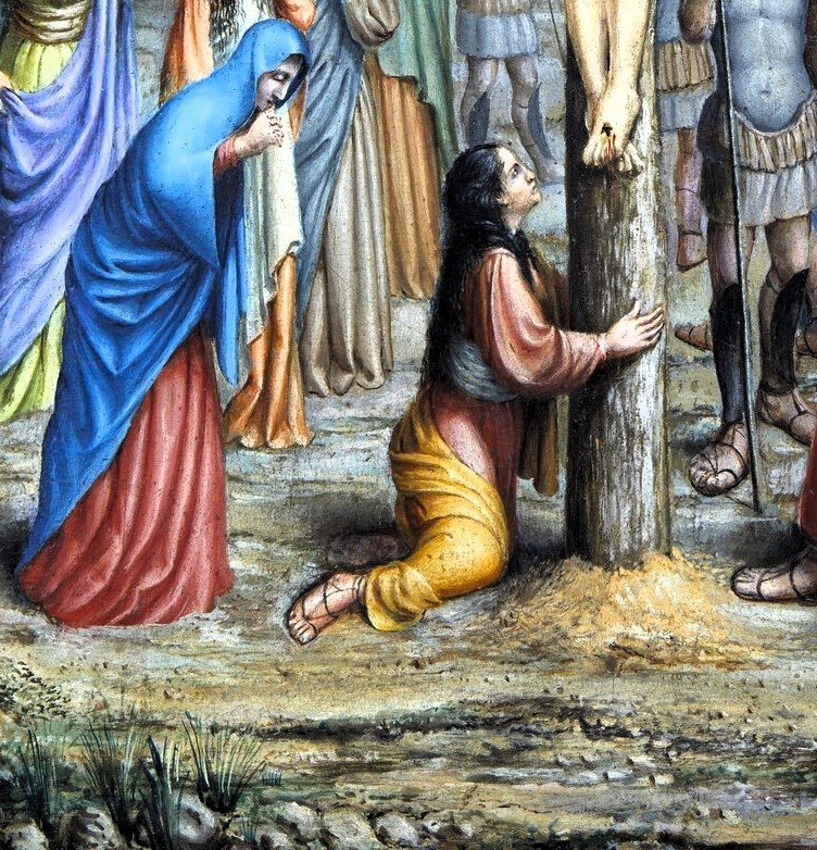 La scène, selon la tradition, montre Marie-Madeleine agenouillée au pied de la croix, partageant sa douleur avec la Madone et saint Jean.