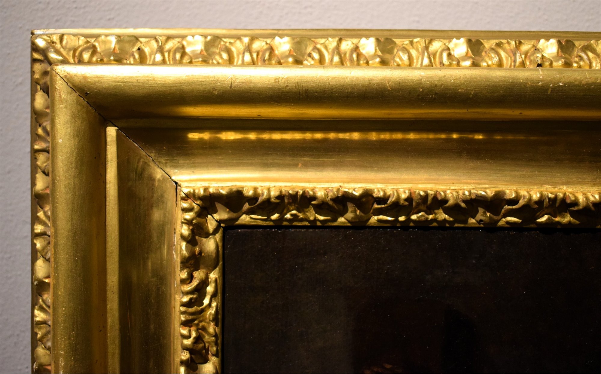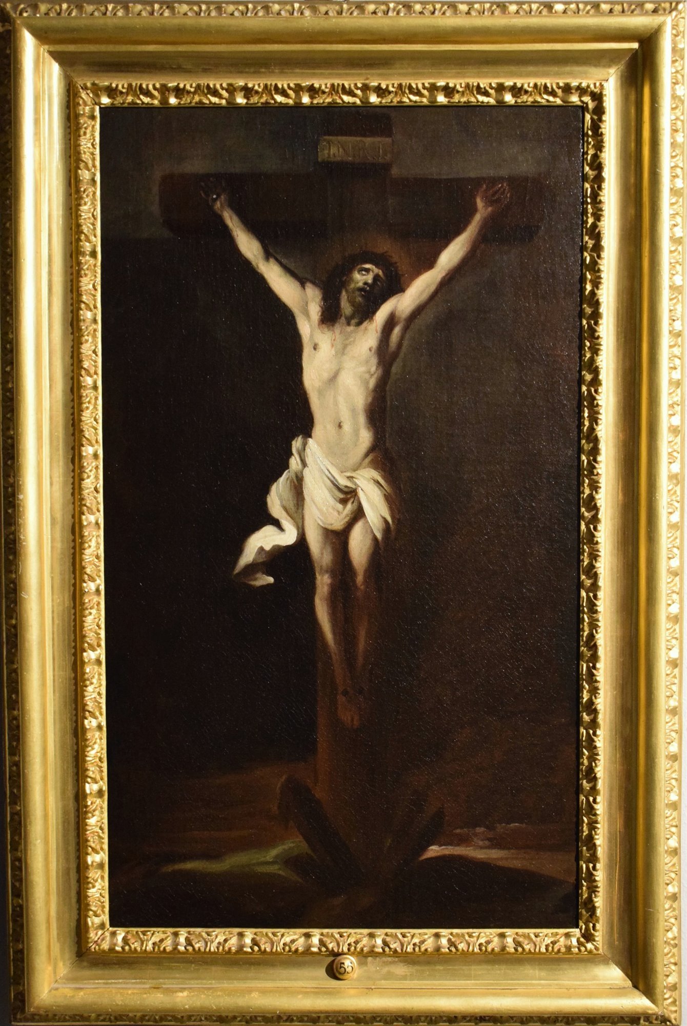 Cette œuvre d'une beauté tragique et d'une puissante émotion représente le Christ en croix sur un ciel livide, soulignant la solitude désolée au cœur du drame de son agonie terrible. Une lumière froide frappe le corps nu et le drapé baroque qui l'enveloppe, agité par le vent. Il est encore vivant, et son visage souffrant, les yeux grands ouverts vers le ciel, implore le ciel de l'aide. C'est le « Fils de Dieu fait homme » qui, accablé de douleur, se tourne vers le Père pour le supplier dans un moment de désespoir. Le sang coule de ses plaies, et des éclairs de lumière entourent sa tête couronnée d'épines. Le ciel est sombre, obscurci par l'éclipse solaire, comme le décrit Luc dans son Évangile. Le paysage austère qui entoure la croix se fond dans l'obscurité de l'arrière-plan et exprime la dimension dramatique dans laquelle se trouve plongé l'état émotionnel du Christ. L'artiste, un peintre flamand, s'est inspiré du célèbre « Christ en croix » d'Anton van Dyck, dont il a réalisé plusieurs copies avec quelques variations mineures, et dont l'une est exposée en Italie, au musée de Gênes. Le succès de cette représentation d'une grande importance, avec une seule image d'une intensité remarquable, en a fait une iconographie symbolique du message chrétien, qui s'est rapidement répandue à travers l'Europe. La toile présentée ici date du milieu du XVIIe siècle, contemporaine des œuvres autographes de Van Dyck, et a été créée par un artiste de grand talent qui en a saisi les mêmes caractéristiques, avec son cadre austère et son puissant effet de clair-obscur. Elle est présentée en très bon état et encadrée d'un magnifique cadre doré.