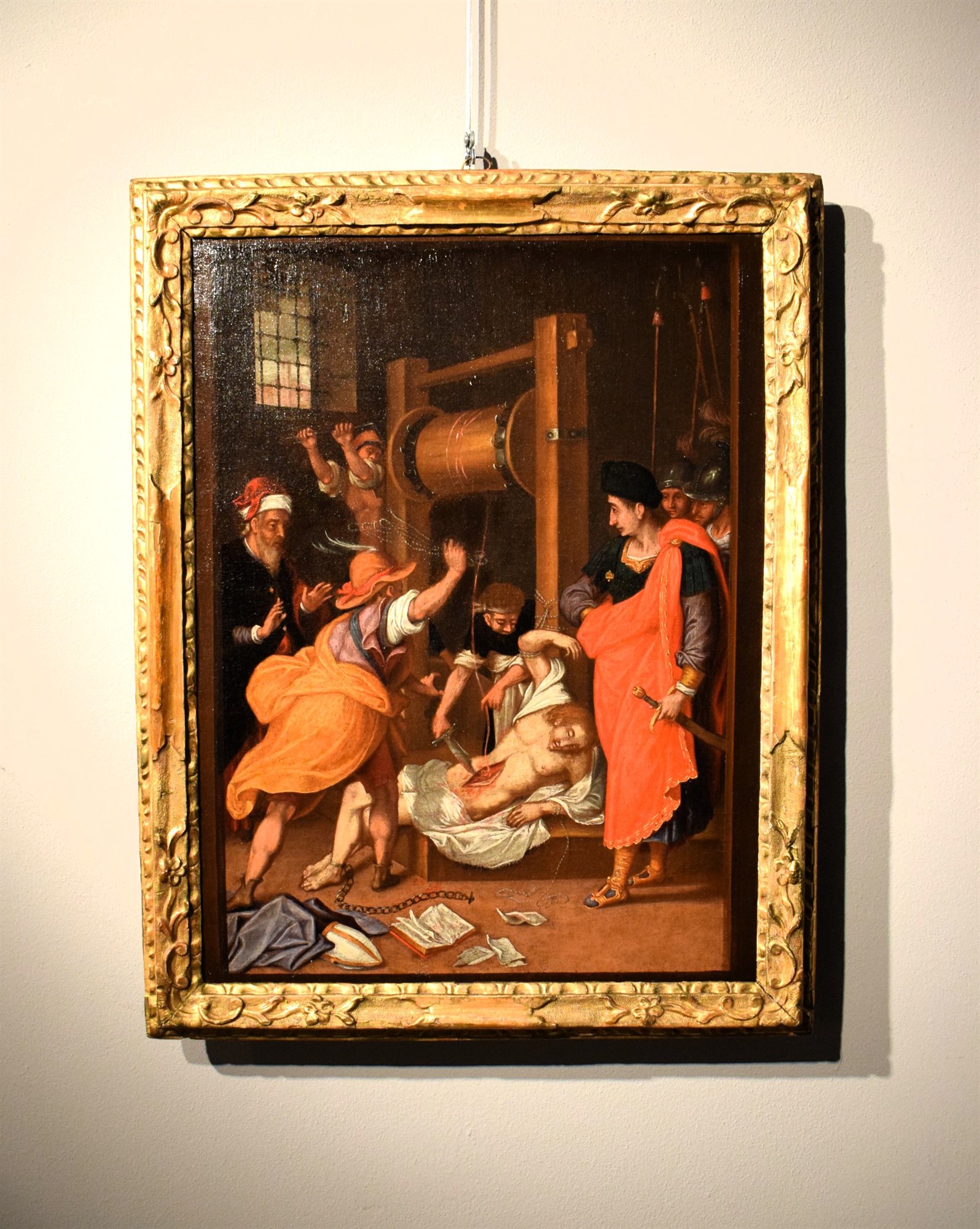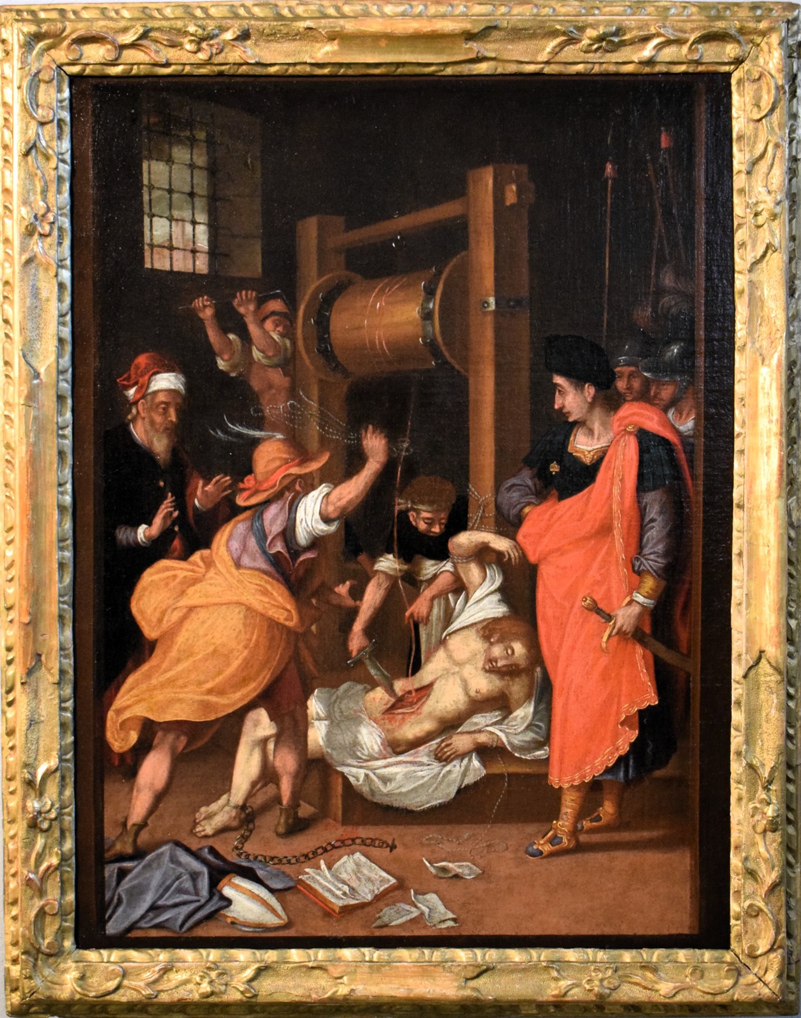 Dans ce cas, l'artiste dépeint le martyre à la manière typique de la peinture flamande, privilégiant un décor en prison plutôt qu'en plein air, conformément aux caractéristiques indéniables de l'art nordique.