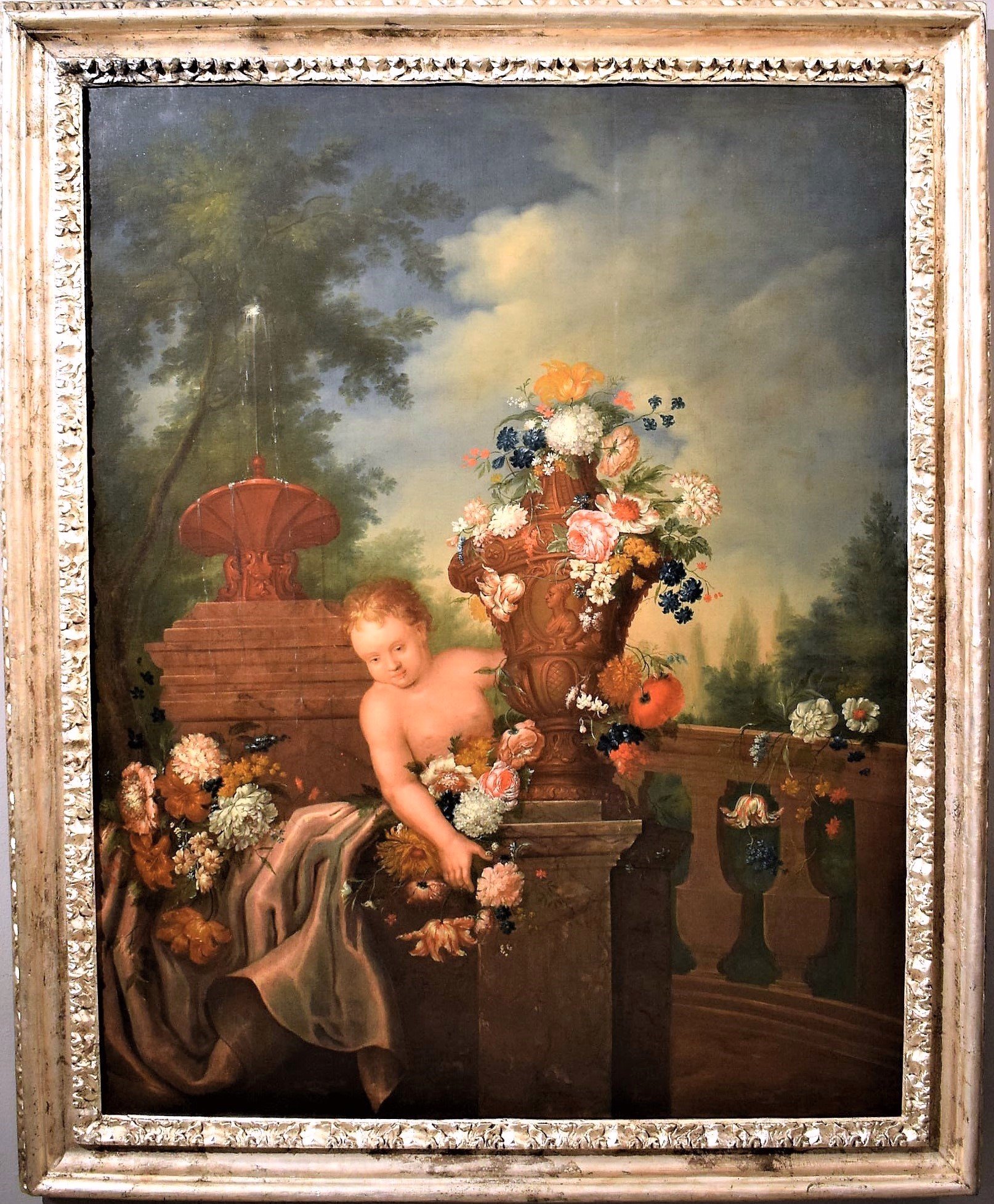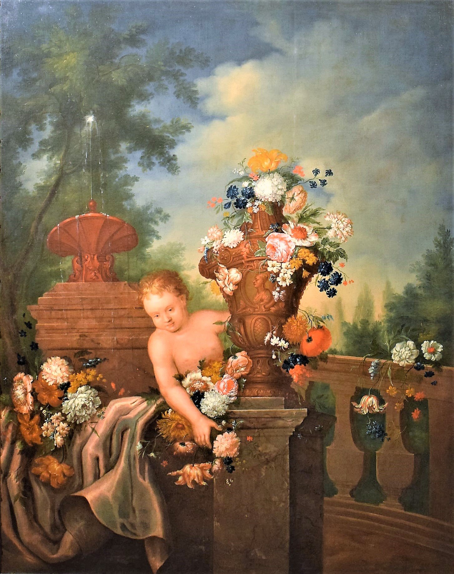 Nature Morte de Fleurs avec Putto et Fontaine dans un jarden