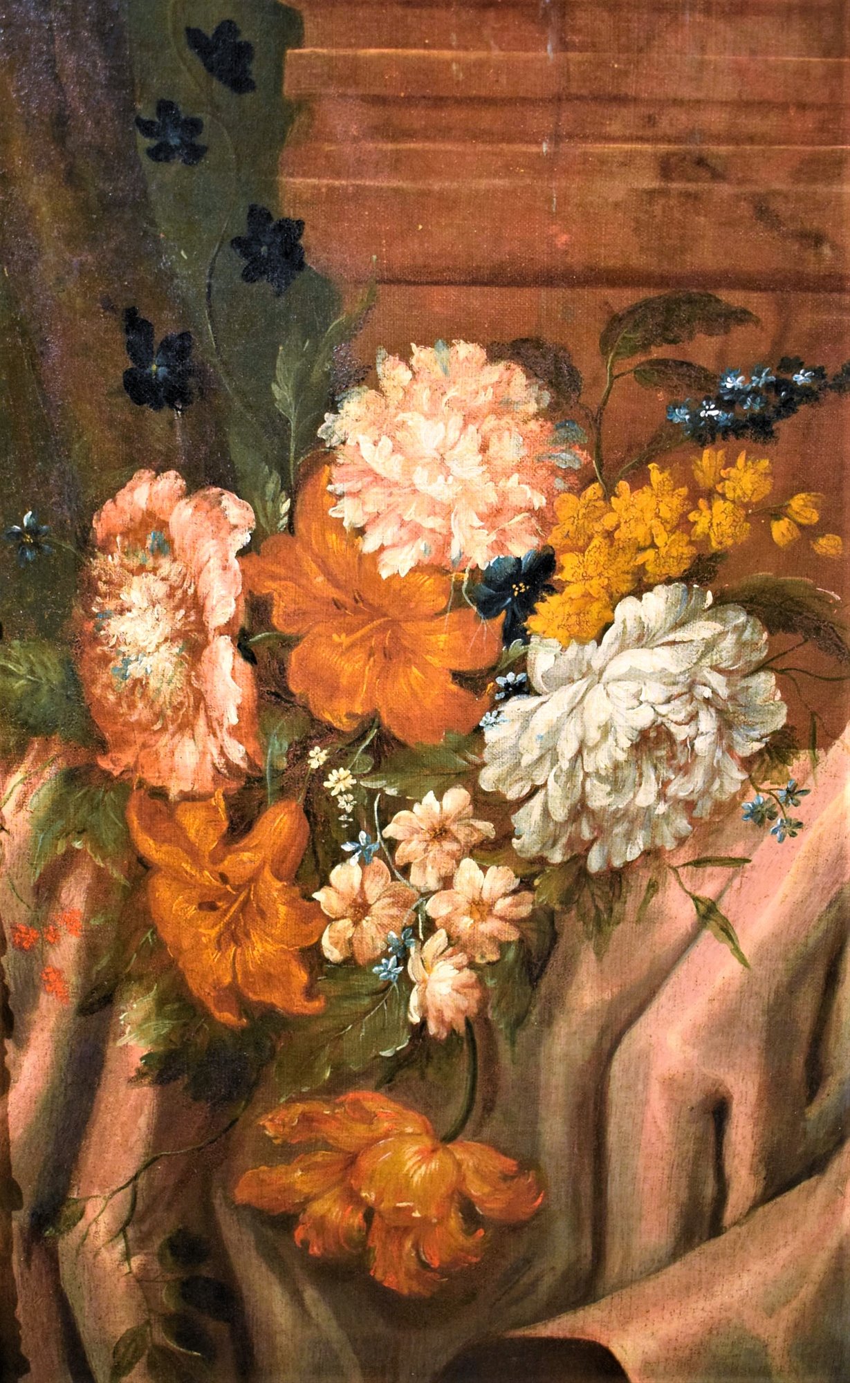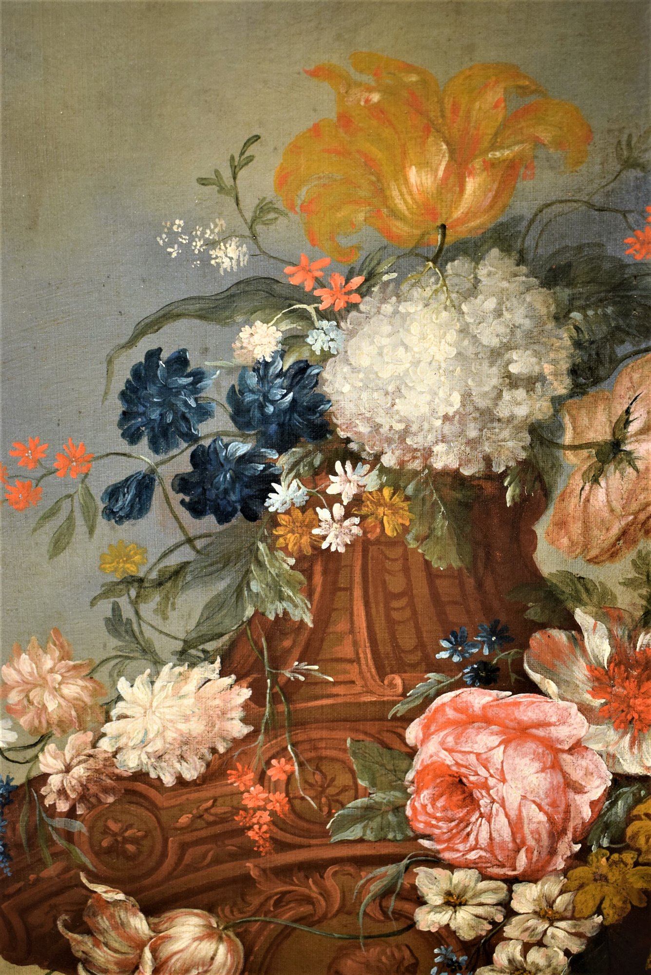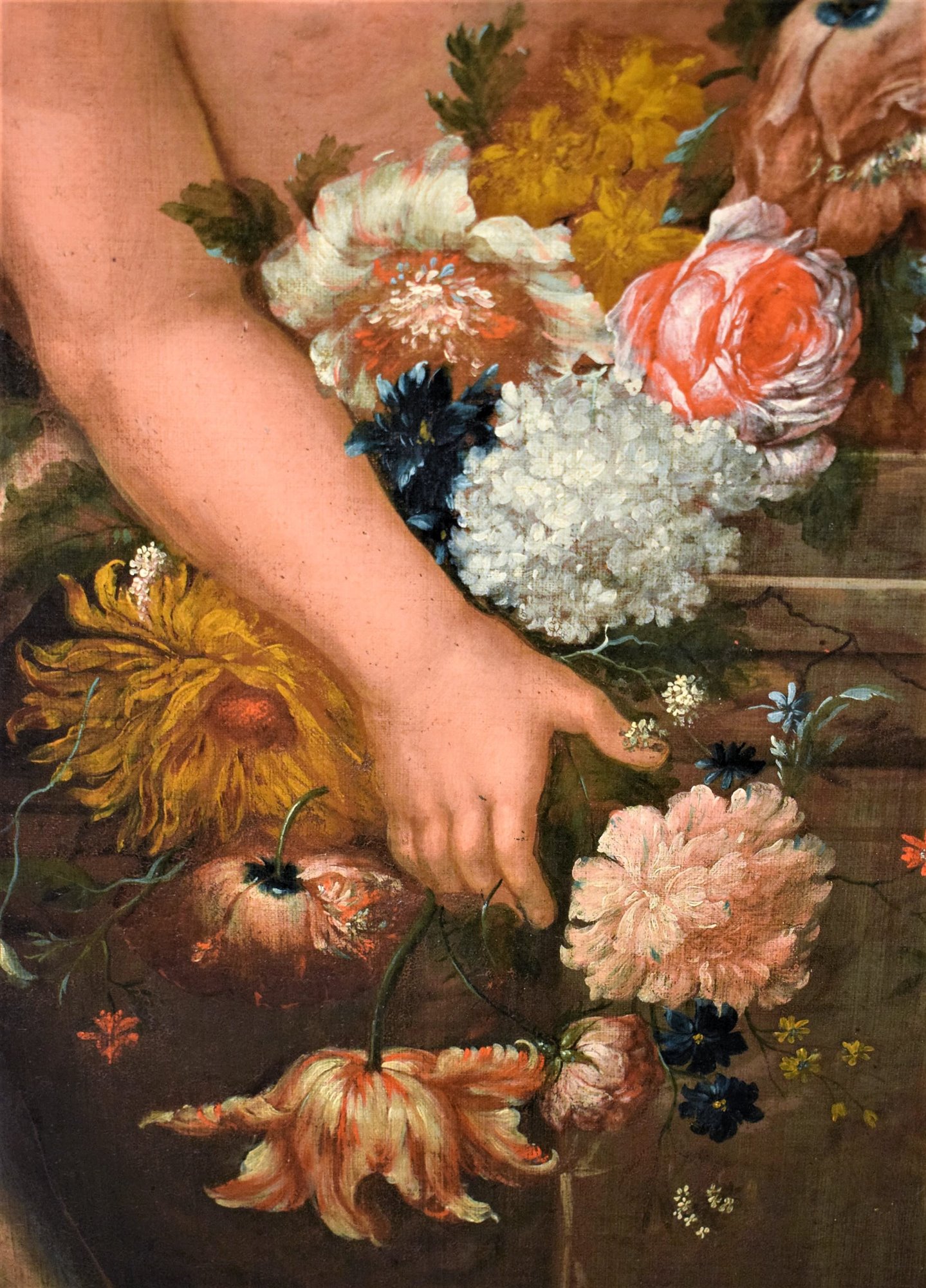 Le spectateur est immédiatement frappé par le vase Médicis plein de fleurs qui se détache au centre du tableau embrassé par un Putto.