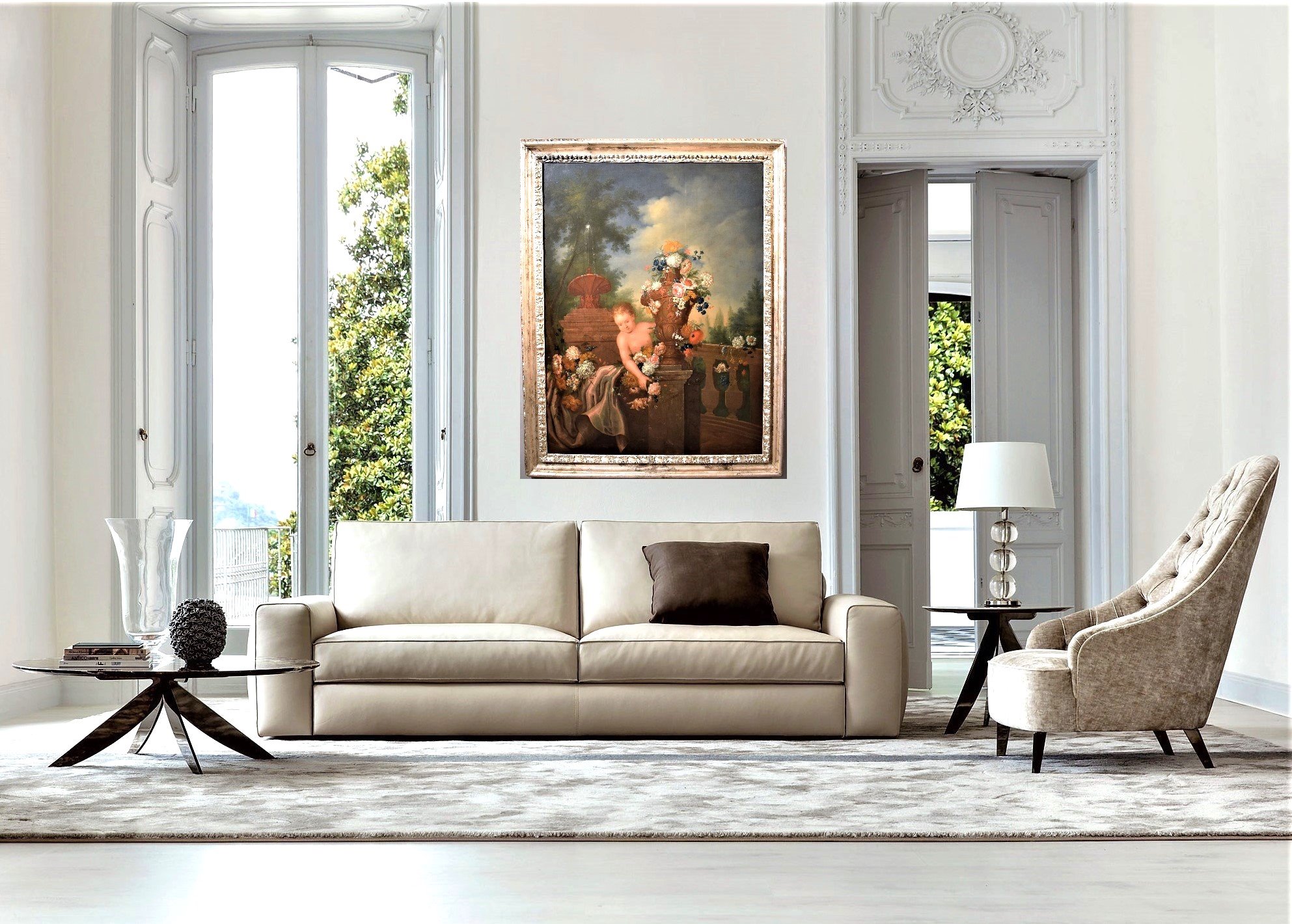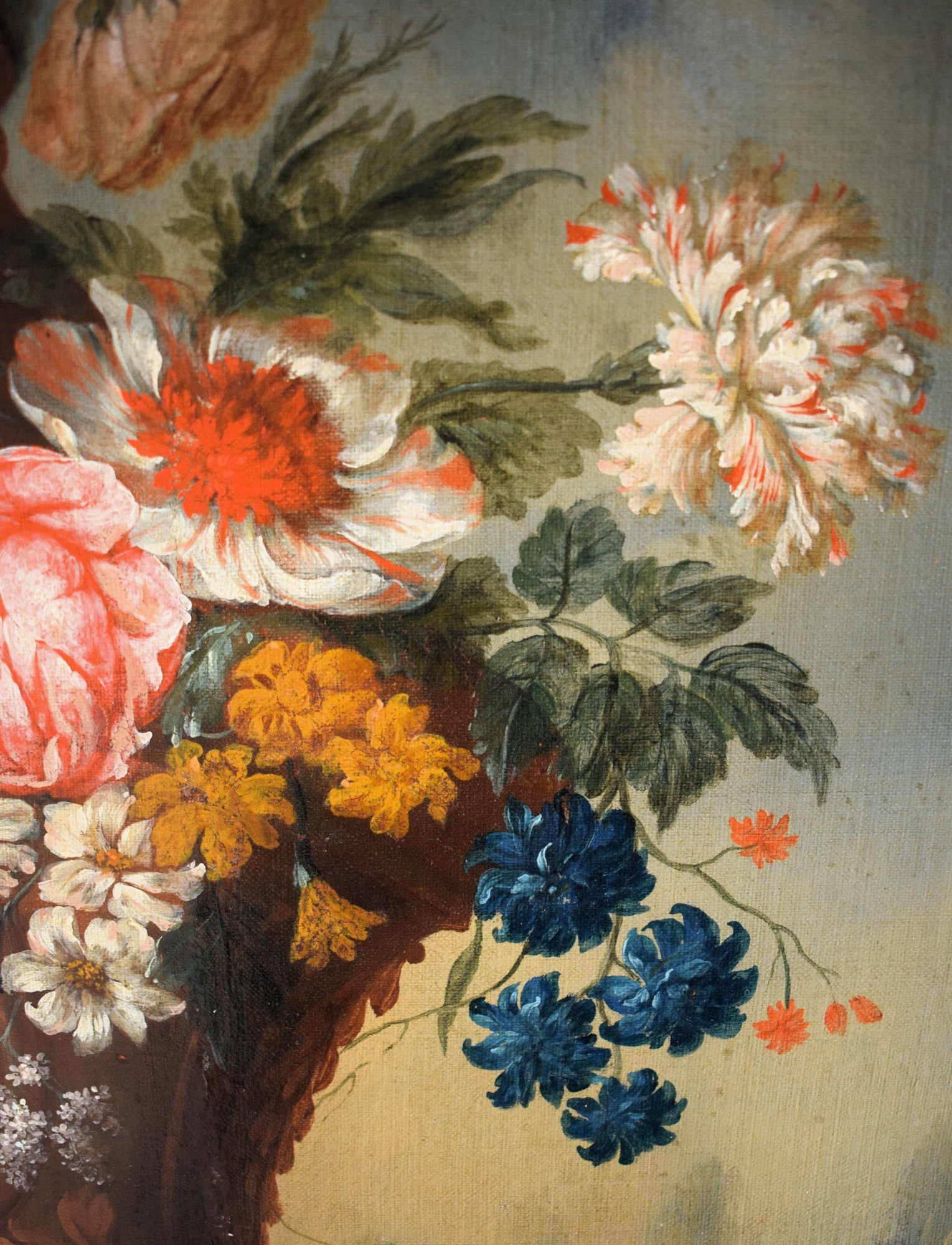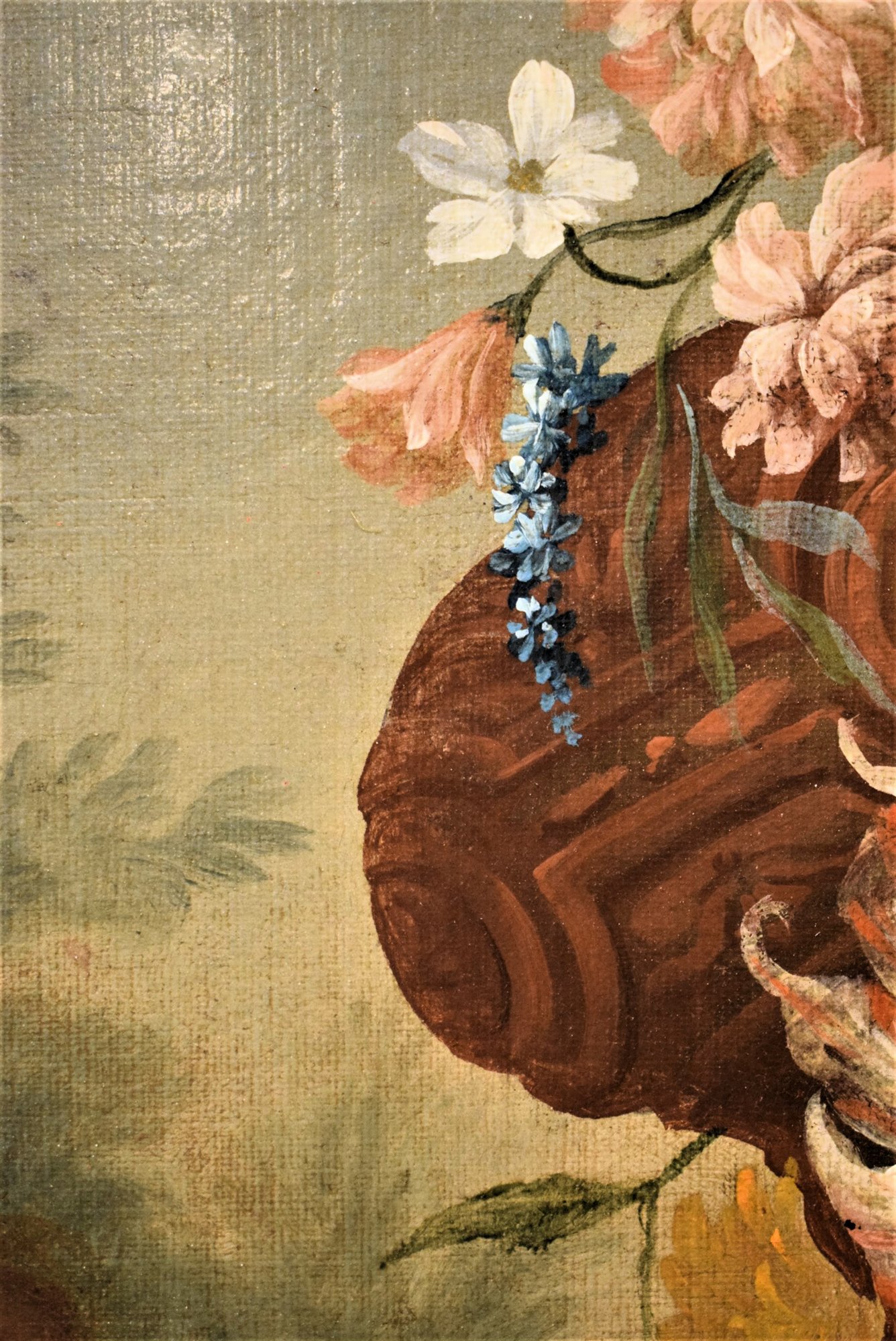 Le spectateur est immédiatement frappé par le vase Médicis plein de fleurs qui se détache au centre du tableau embrassé par un Putto.