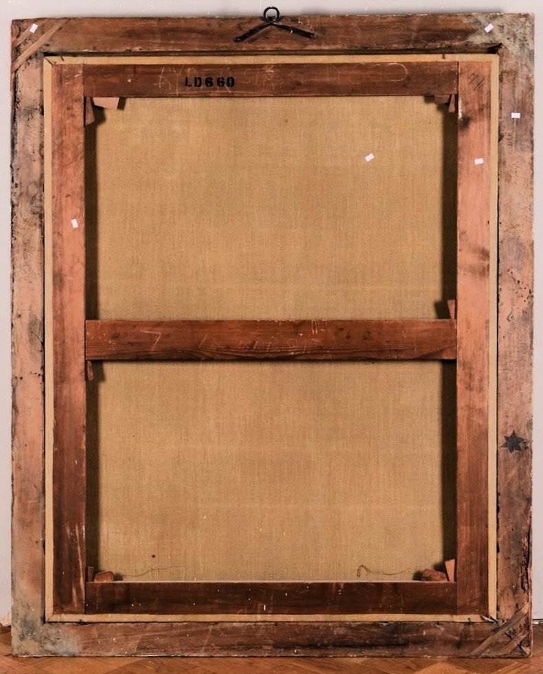 Le tableau a été parfaitement rentoilé et le importante cadre d'origine du 18ème siècle a été restauré dans notre atelier.