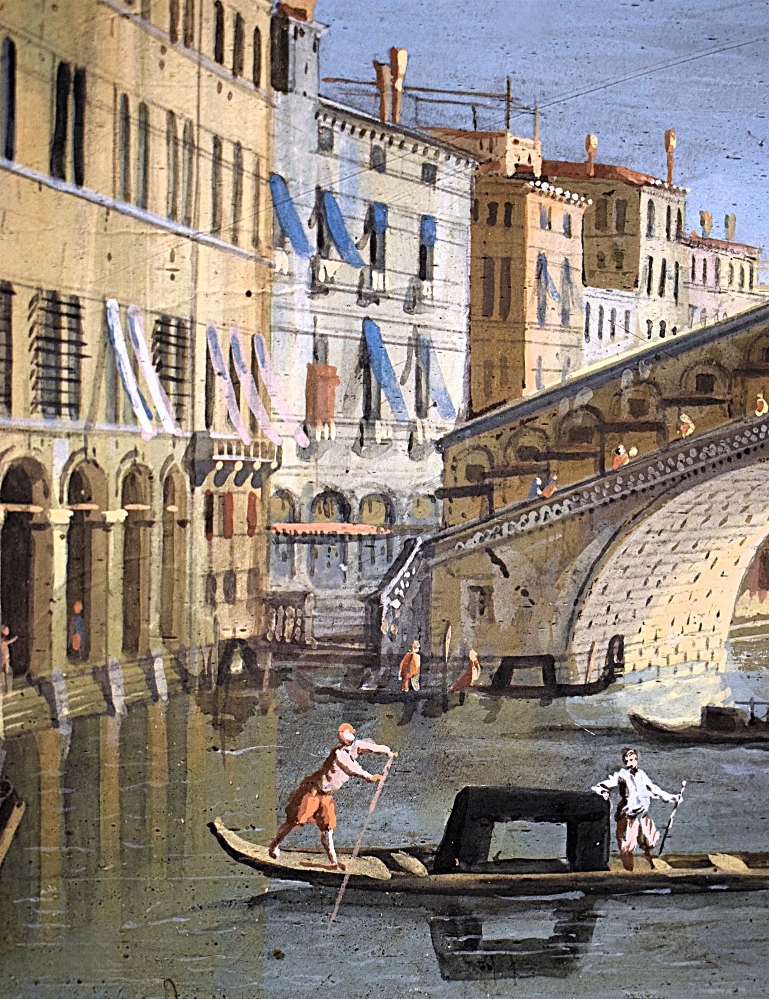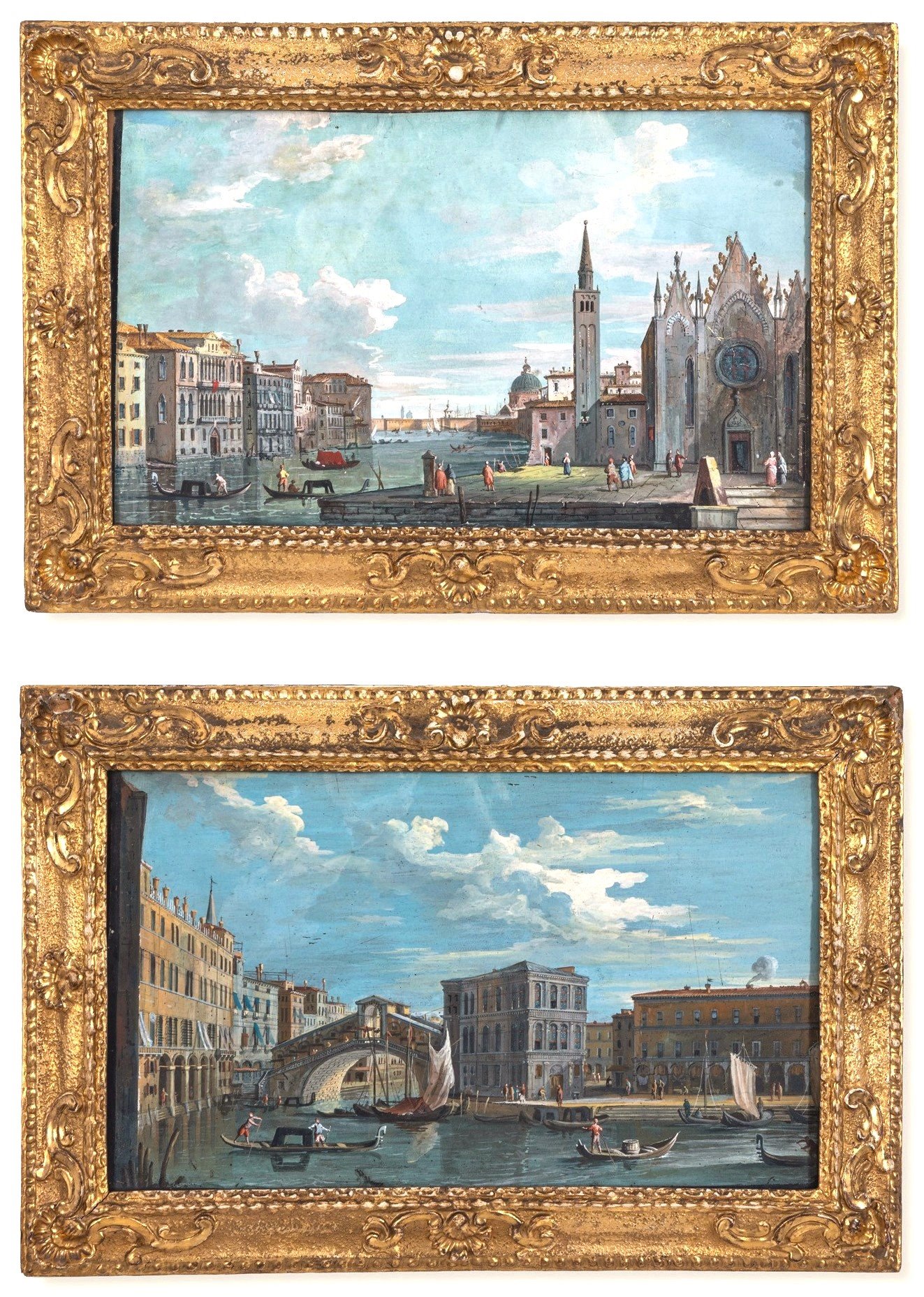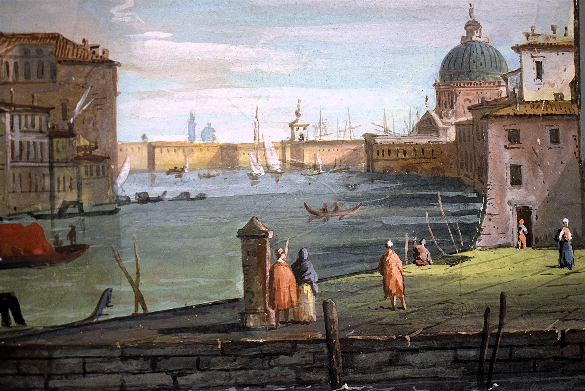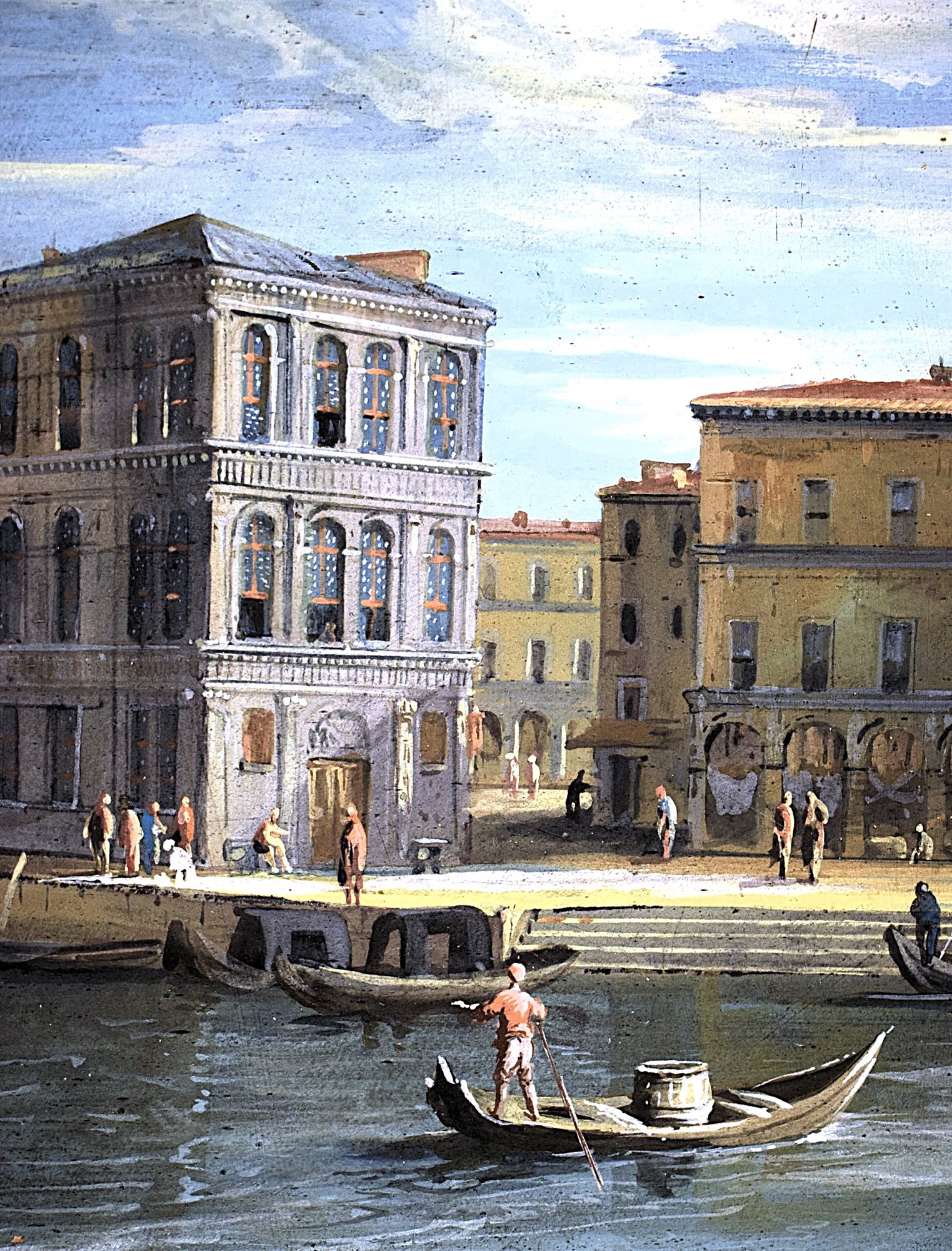 Ces deux magnifiques vues de Venise, peintes à la gouache sur papier vers la fin du XVIIIe siècle, sont attribuées à Giacomo Guardi et à son atelier renommé. Elles représentent deux vues spectaculaires du Grand Canal : l'une avec le pont du Rialto et le Palazzo dei Camerlenghi, l'autre avec l'église Santa Maria della Carità et la Piazza dell'Accademia. Il est intéressant d'admirer l'église telle qu'elle apparaissait au XVIIIe siècle, avec sa façade gothique. Les flèches pyramidales à pinacles et édicules ont disparu au XIXe siècle, ne subsistant que dans les peintures d'époque.