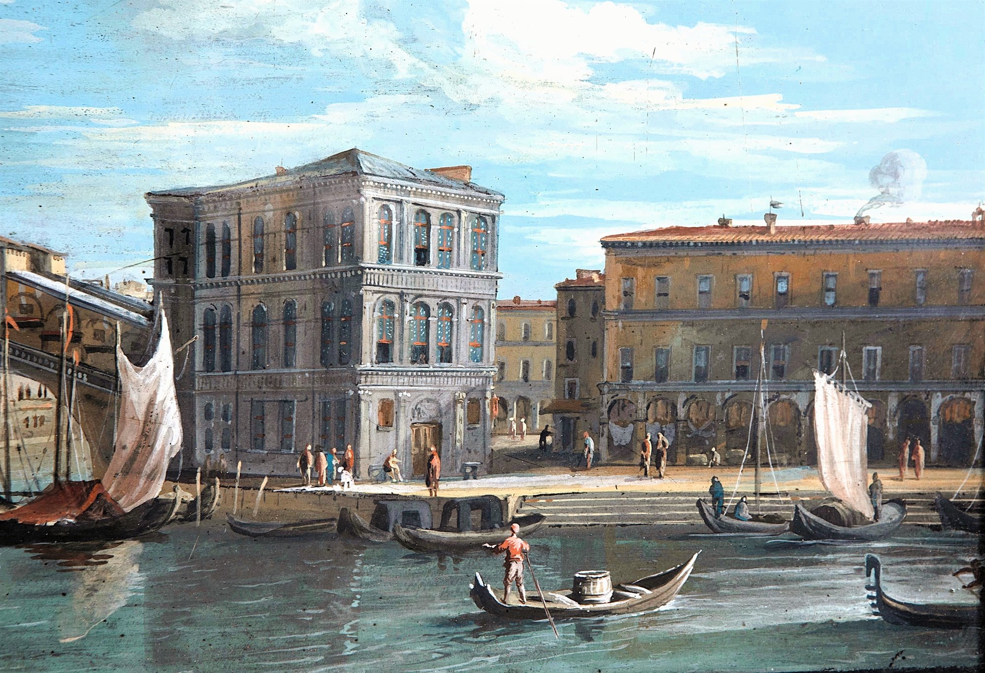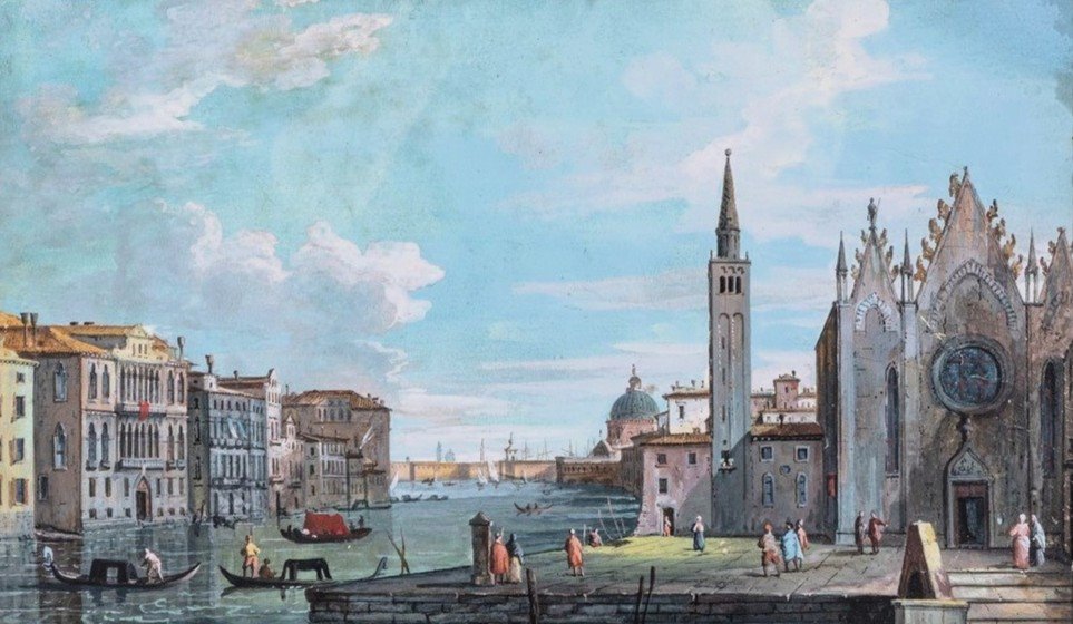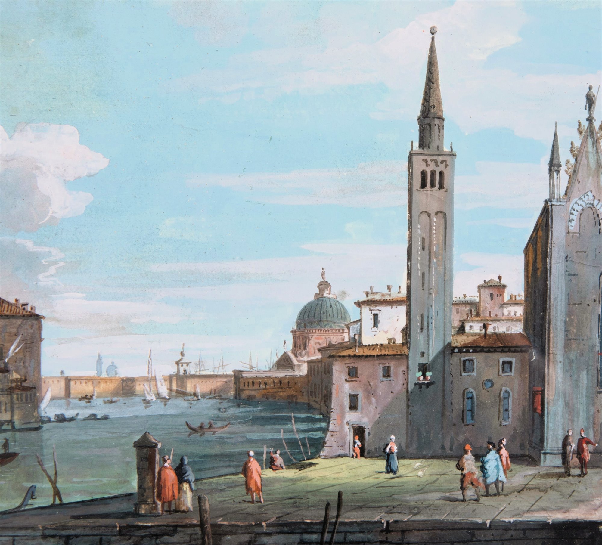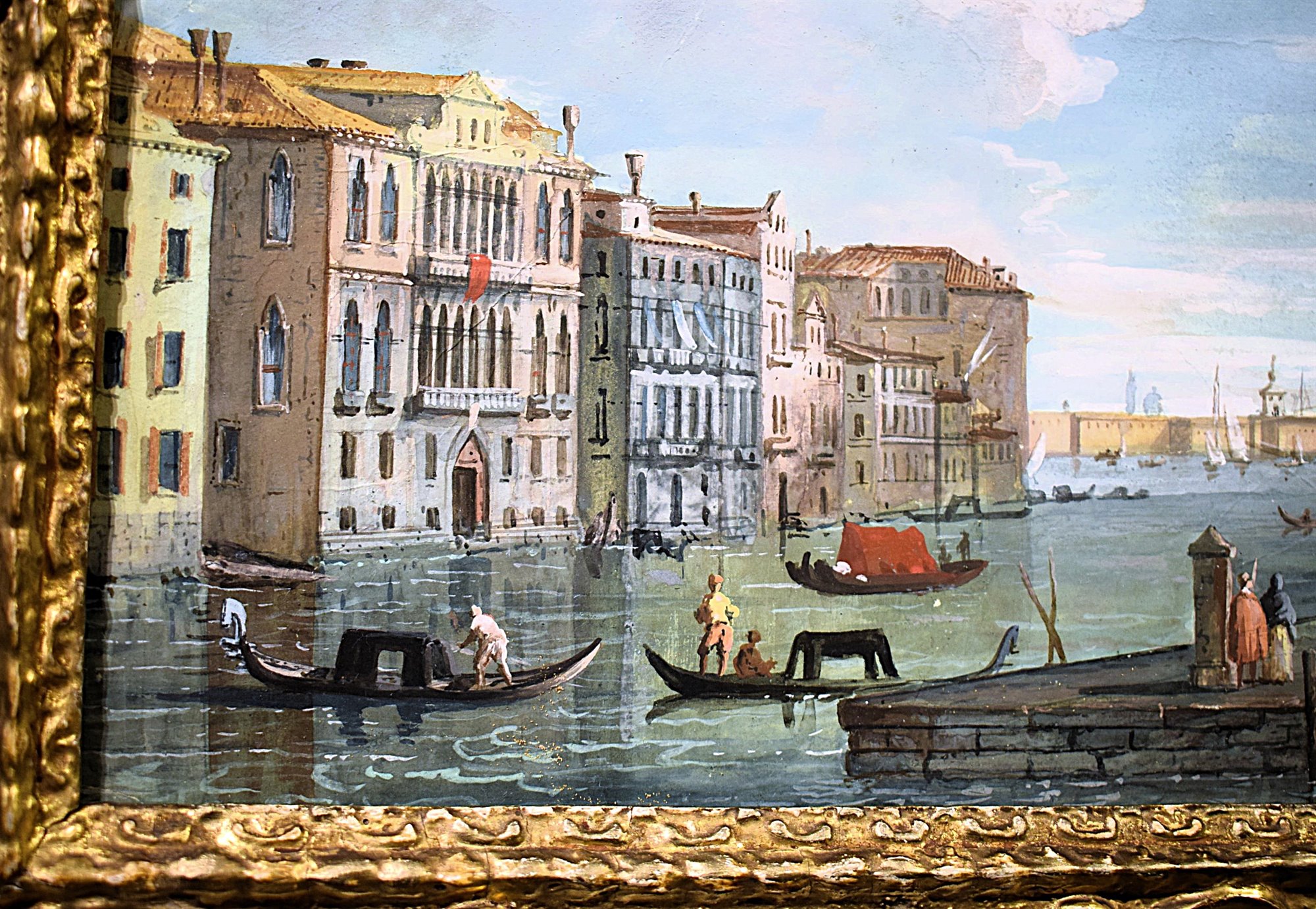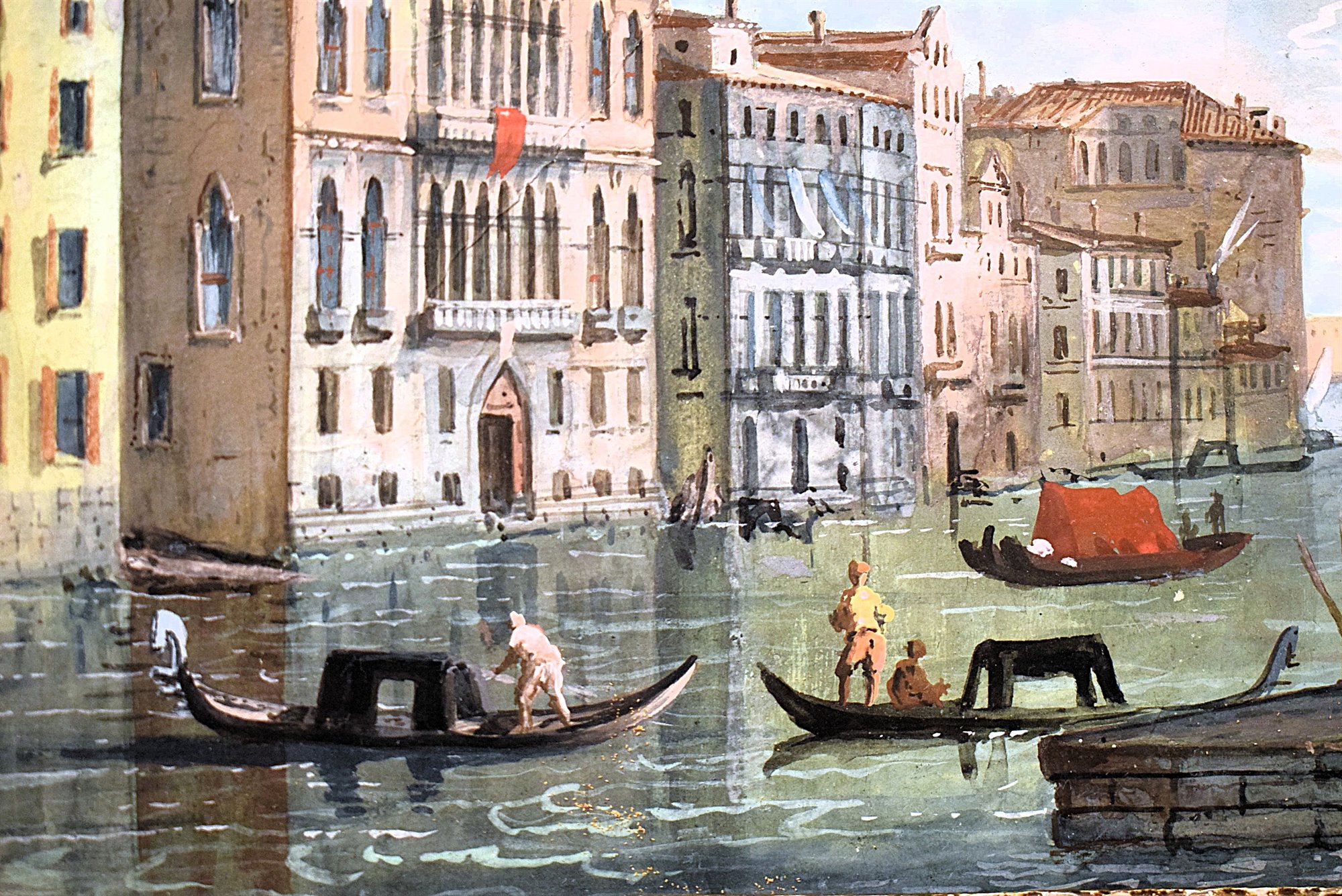 Ces deux magnifiques vues de Venise, peintes à la gouache sur papier vers la fin du XVIIIe siècle, sont attribuées à Giacomo Guardi et à son atelier renommé. Elles représentent deux vues spectaculaires du Grand Canal : l'une avec le pont du Rialto et le Palazzo dei Camerlenghi, l'autre avec l'église Santa Maria della Carità et la Piazza dell'Accademia. Il est intéressant d'admirer l'église telle qu'elle apparaissait au XVIIIe siècle, avec sa façade gothique. Les flèches pyramidales à pinacles et édicules ont disparu au XIXe siècle, ne subsistant que dans les peintures d'époque.