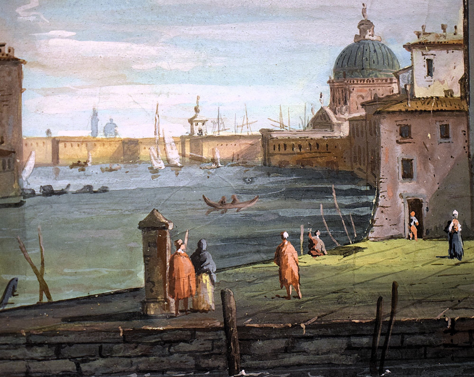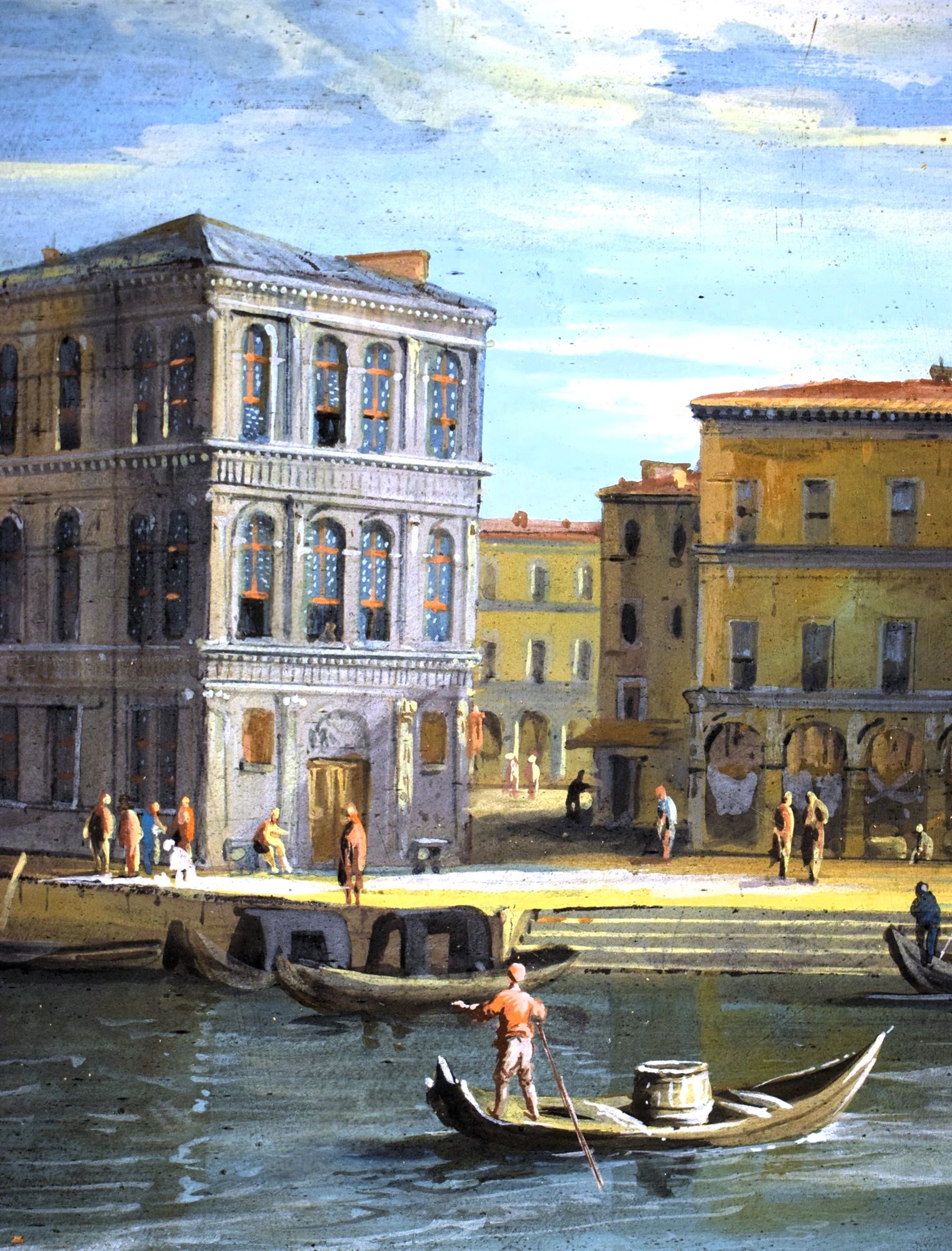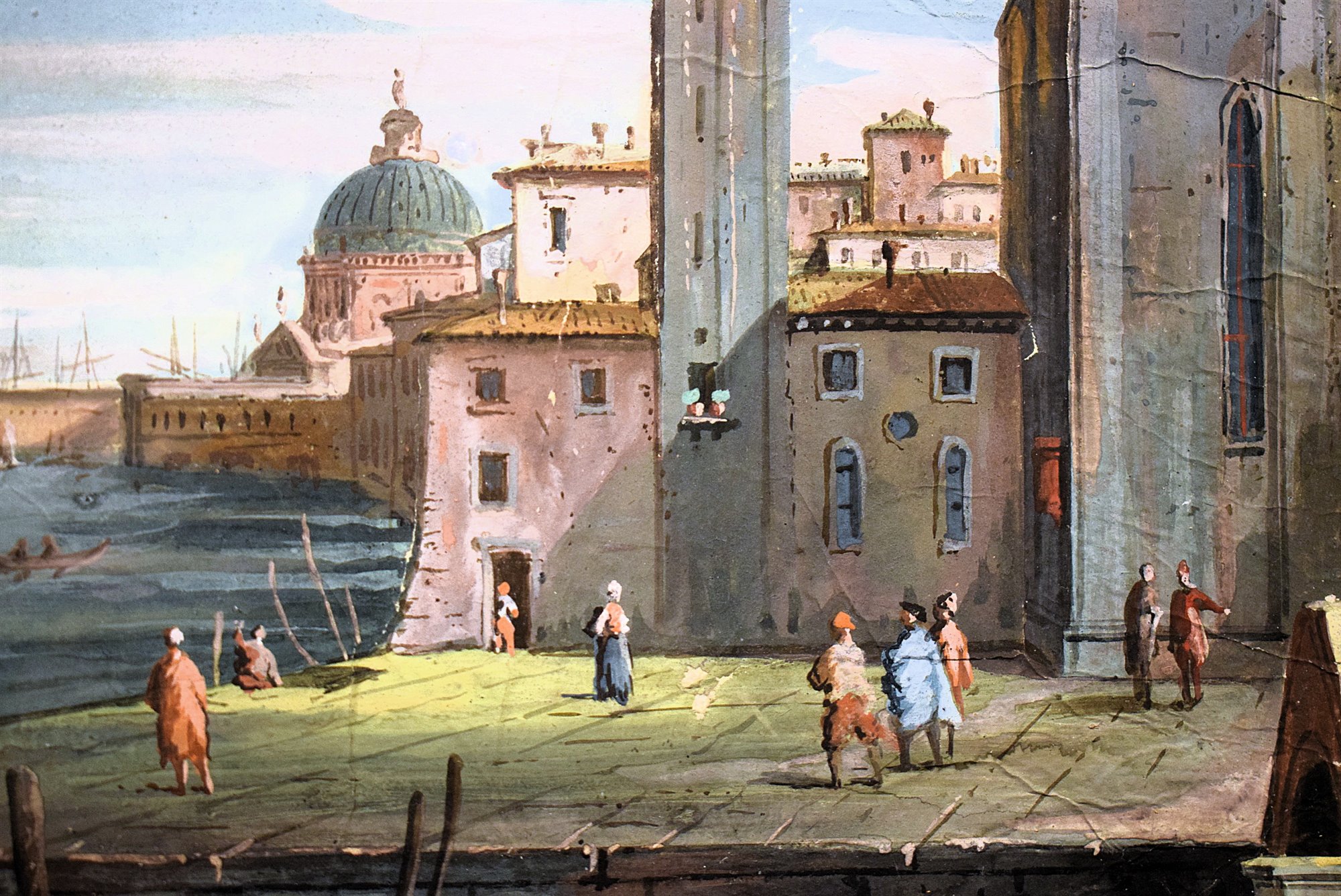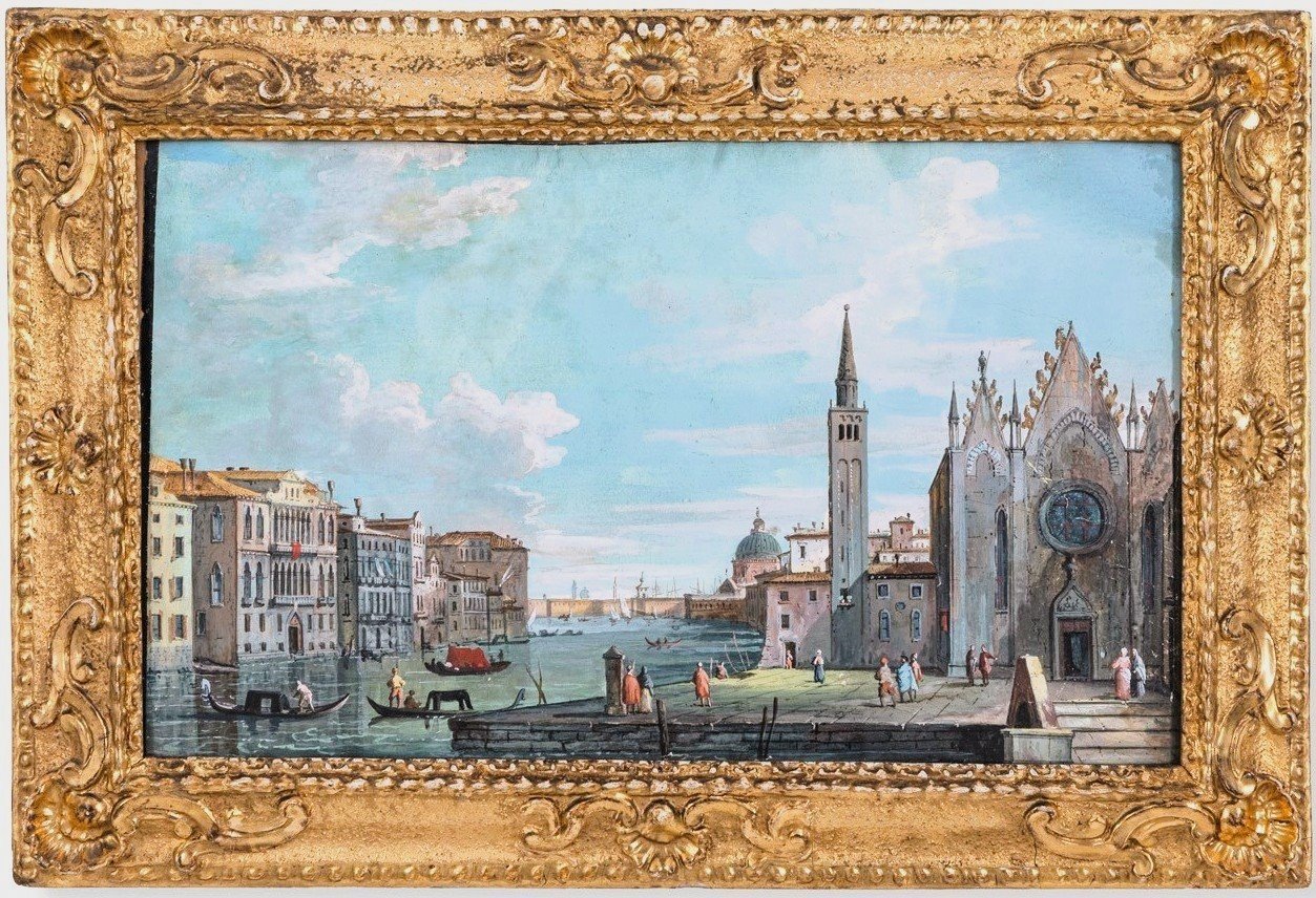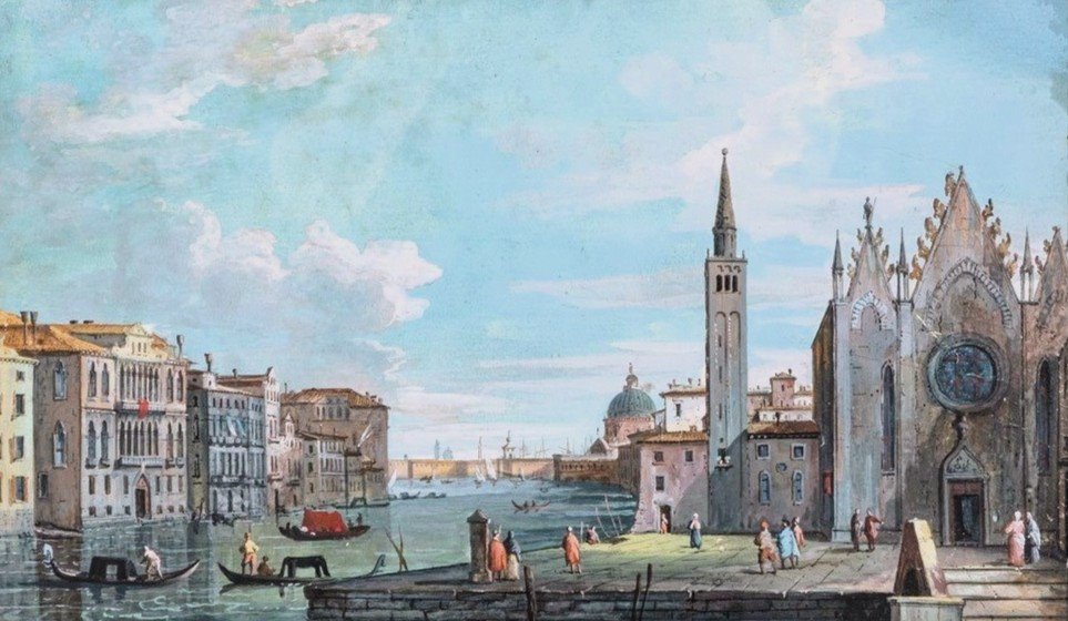 Ces deux magnifiques vues de Venise, peintes à la gouache sur papier vers la fin du XVIIIe siècle, sont attribuées à Giacomo Guardi et à son atelier renommé. Elles représentent deux vues spectaculaires du Grand Canal : l'une avec le pont du Rialto et le Palazzo dei Camerlenghi, l'autre avec l'église Santa Maria della Carità et la Piazza dell'Accademia. Il est intéressant d'admirer l'église telle qu'elle apparaissait au XVIIIe siècle, avec sa façade gothique. Les flèches pyramidales à pinacles et édicules ont disparu au XIXe siècle, ne subsistant que dans les peintures d'époque.