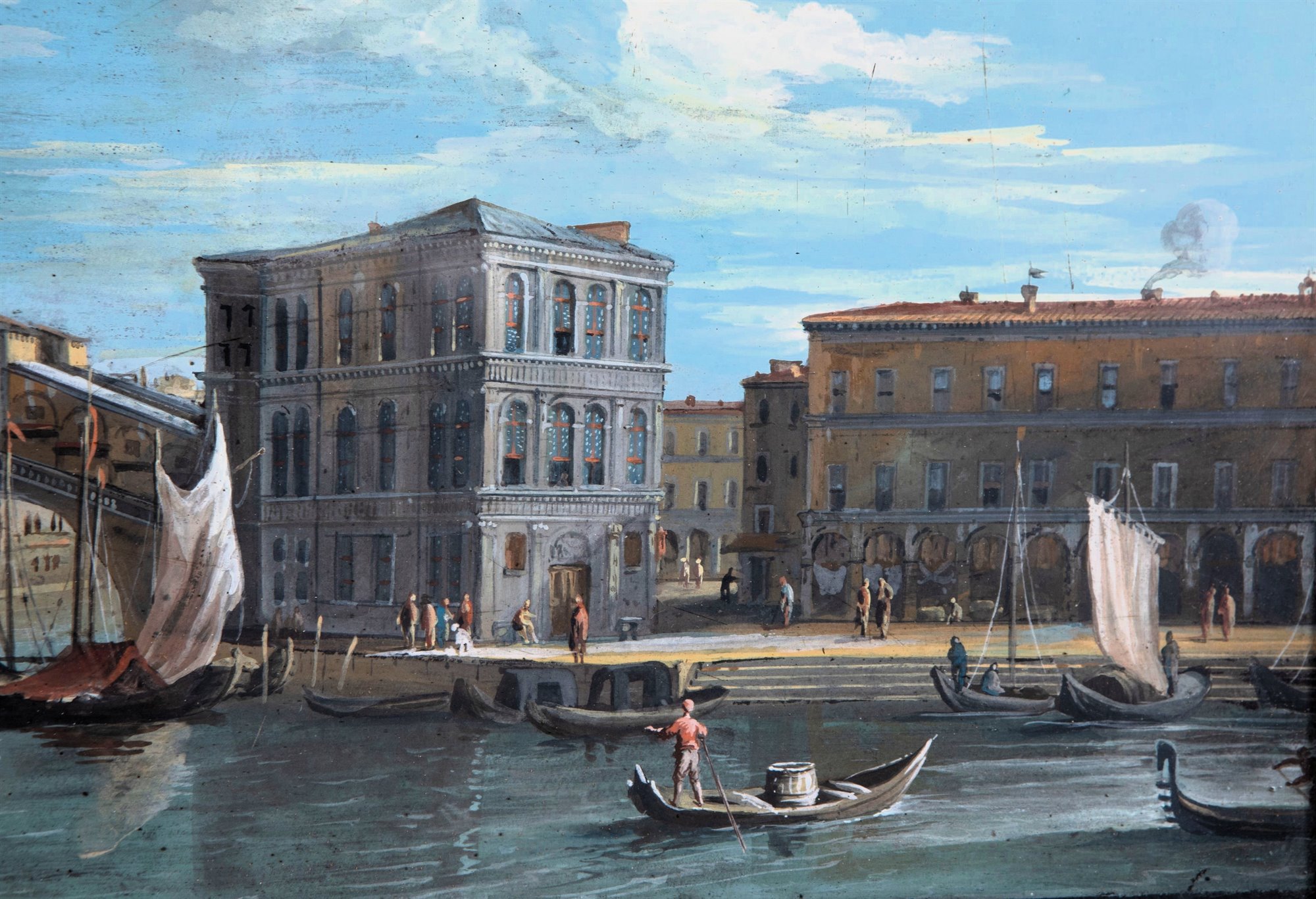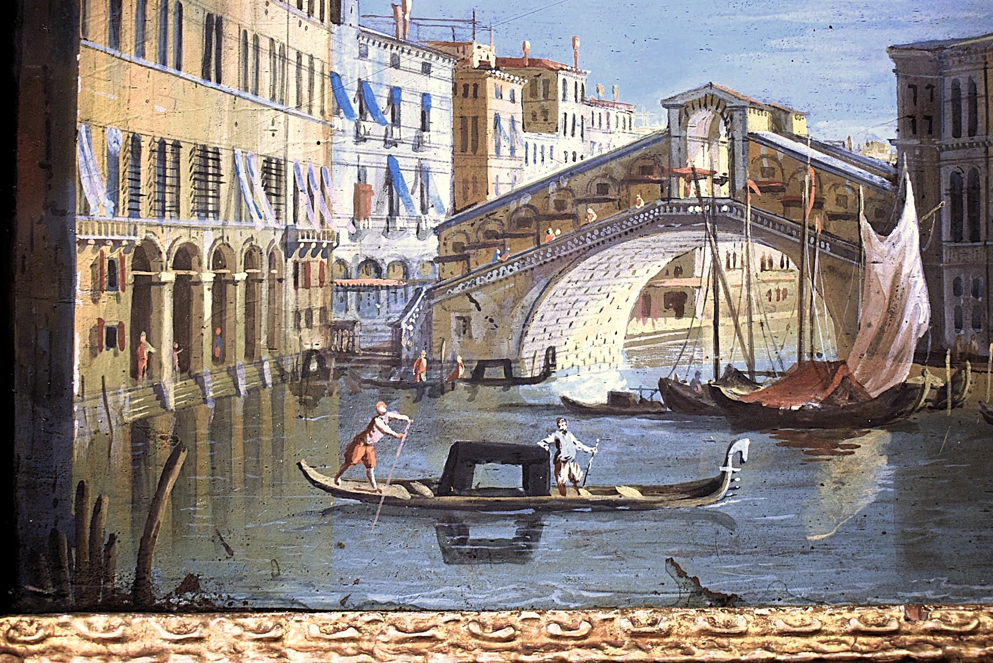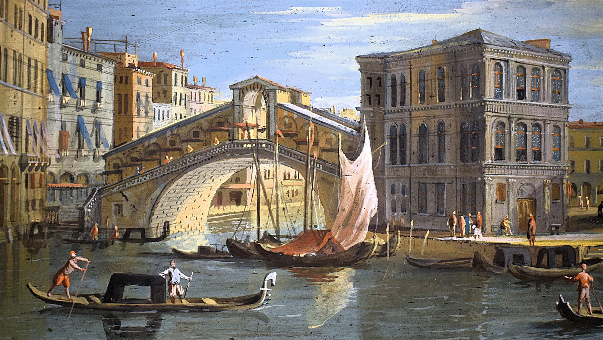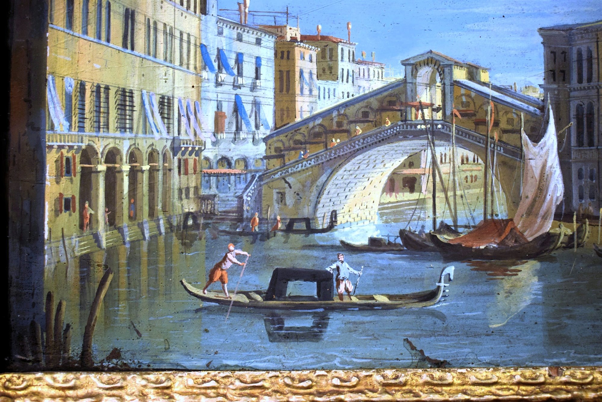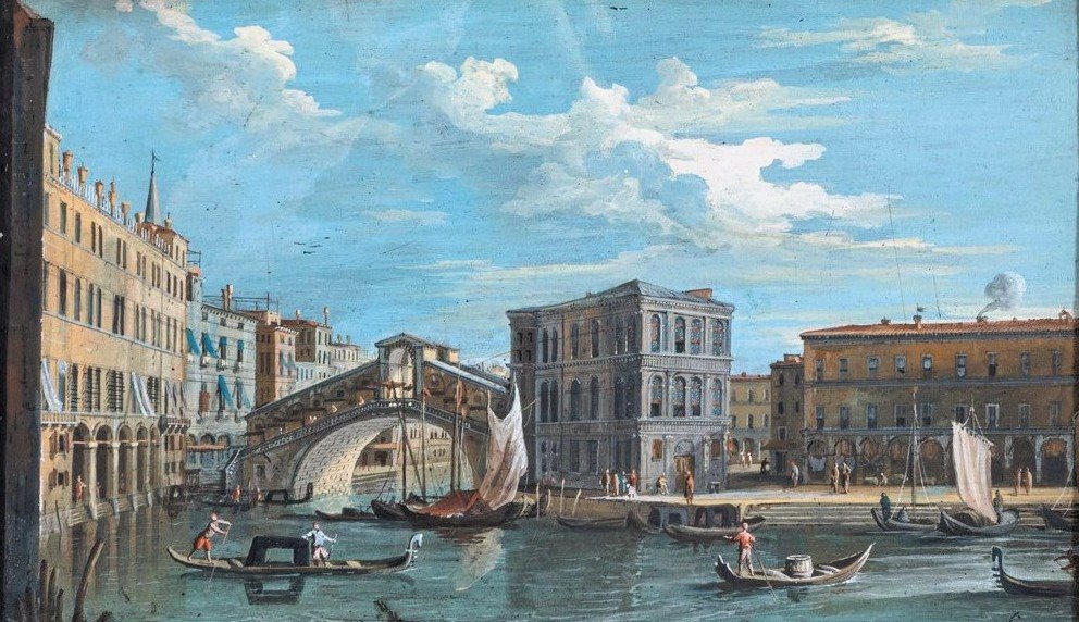 Ces deux magnifiques vues de Venise, peintes à la gouache sur papier vers la fin du XVIIIe siècle, sont attribuées à Giacomo Guardi et à son atelier renommé. Elles représentent deux vues spectaculaires du Grand Canal : l'une avec le pont du Rialto et le Palazzo dei Camerlenghi, l'autre avec l'église Santa Maria della Carità et la Piazza dell'Accademia. Il est intéressant d'admirer l'église telle qu'elle apparaissait au XVIIIe siècle, avec sa façade gothique. Les flèches pyramidales à pinacles et édicules ont disparu au XIXe siècle, ne subsistant que dans les peintures d'époque.