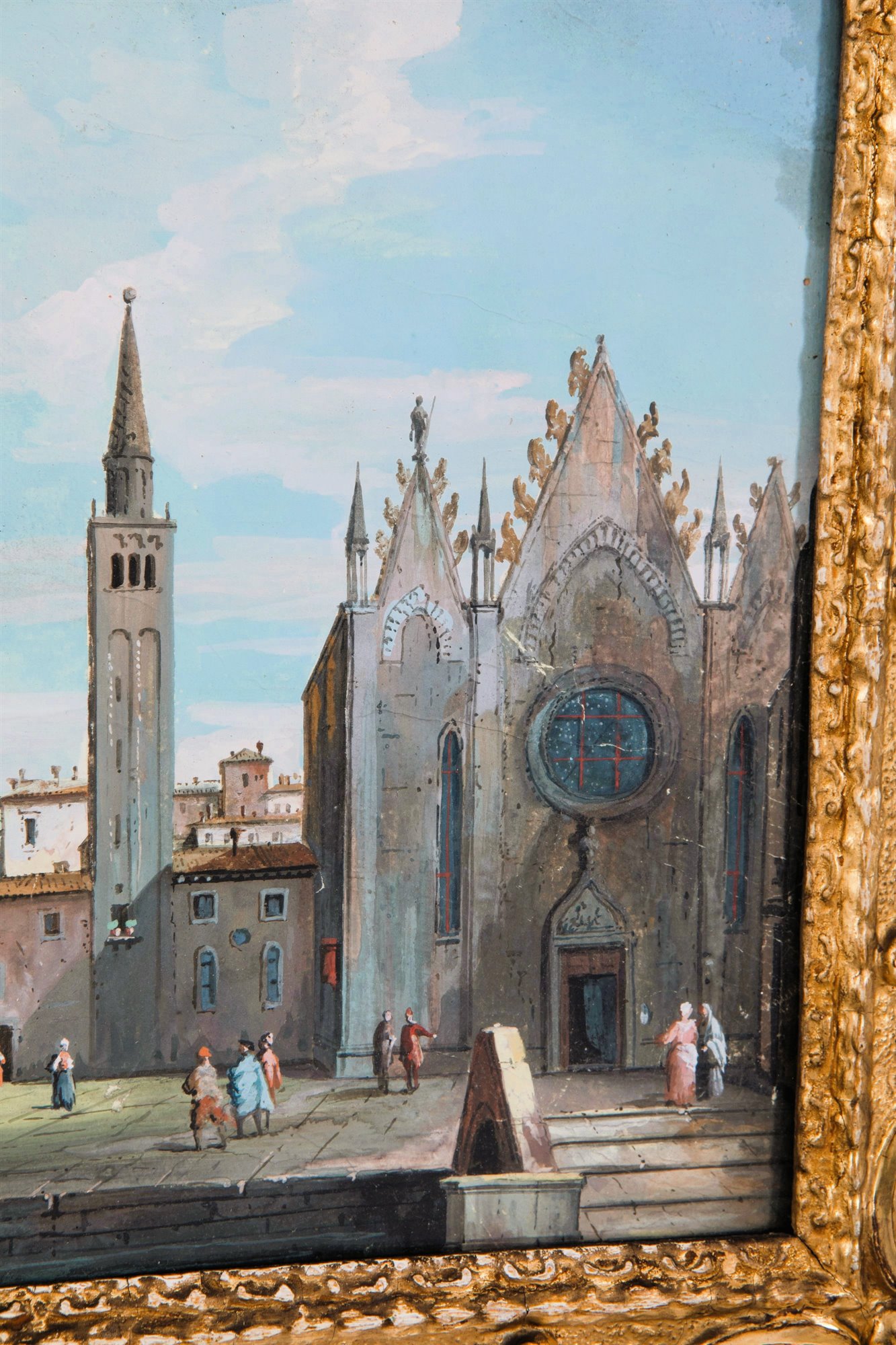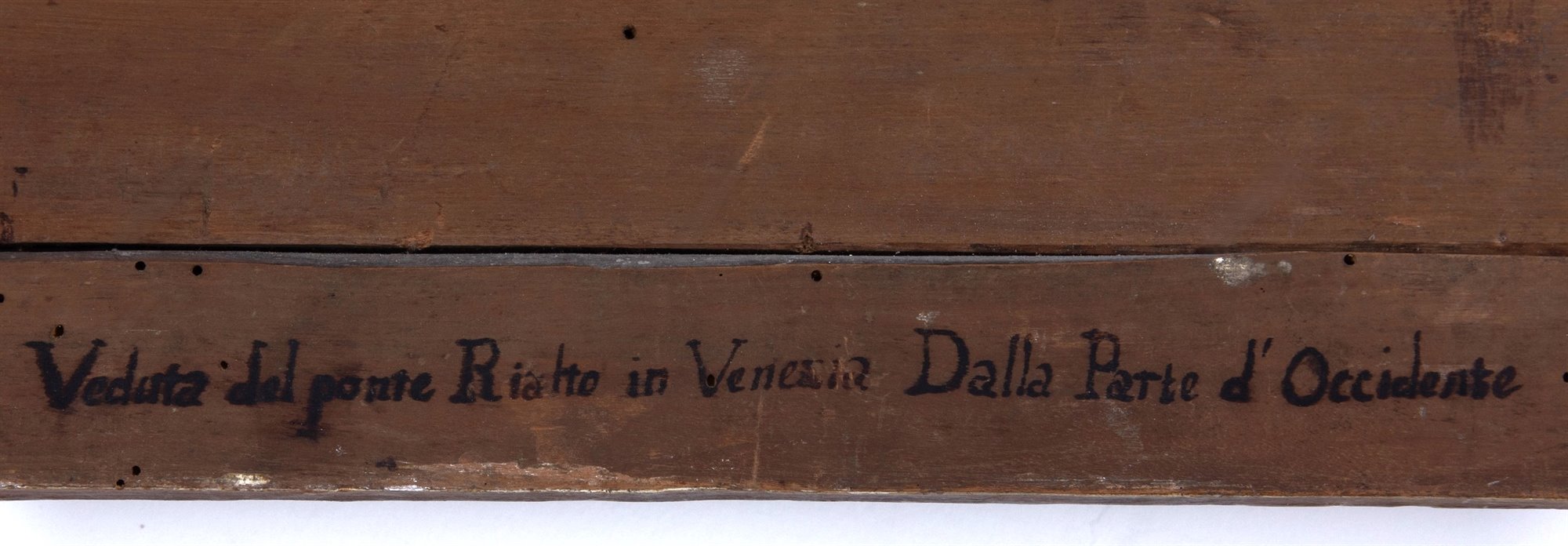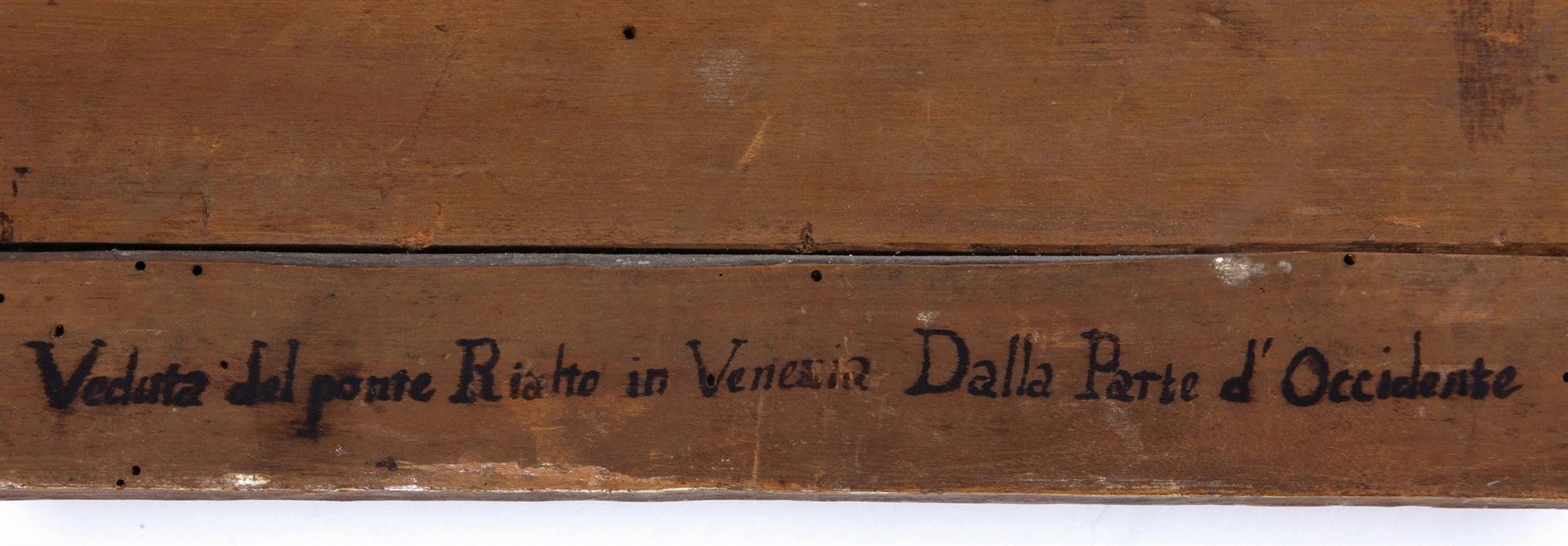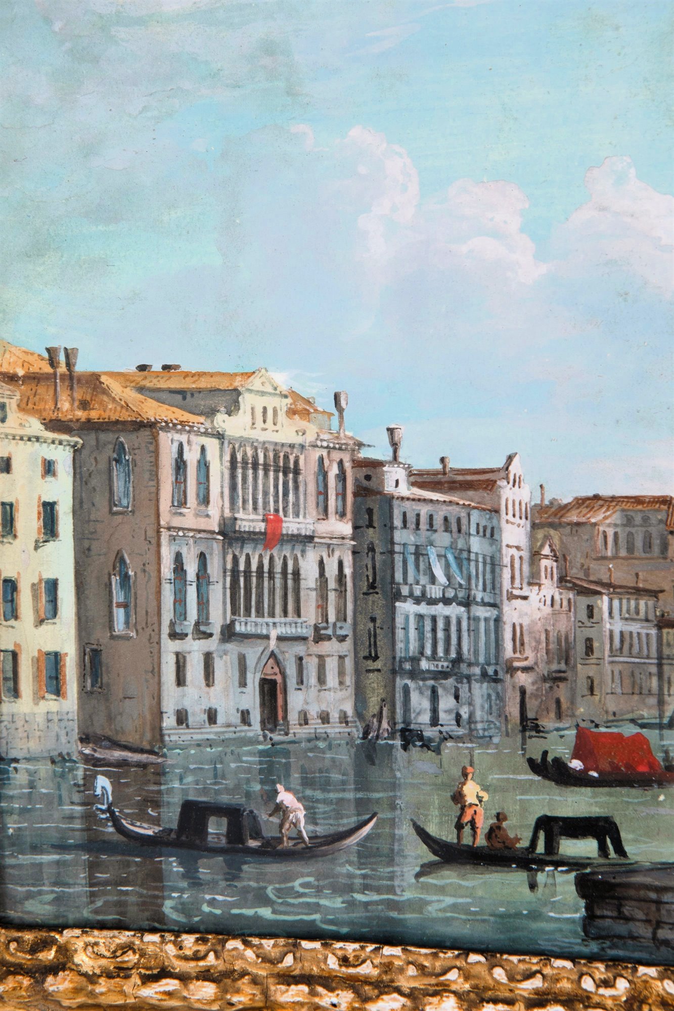 Ces deux magnifiques vues de Venise, peintes à la gouache sur papier vers la fin du XVIIIe siècle, sont attribuées à Giacomo Guardi et à son atelier renommé. Elles représentent deux vues spectaculaires du Grand Canal : l'une avec le pont du Rialto et le Palazzo dei Camerlenghi, l'autre avec l'église Santa Maria della Carità et la Piazza dell'Accademia. Il est intéressant d'admirer l'église telle qu'elle apparaissait au XVIIIe siècle, avec sa façade gothique. Les flèches pyramidales à pinacles et édicules ont disparu au XIXe siècle, ne subsistant que dans les peintures d'époque.