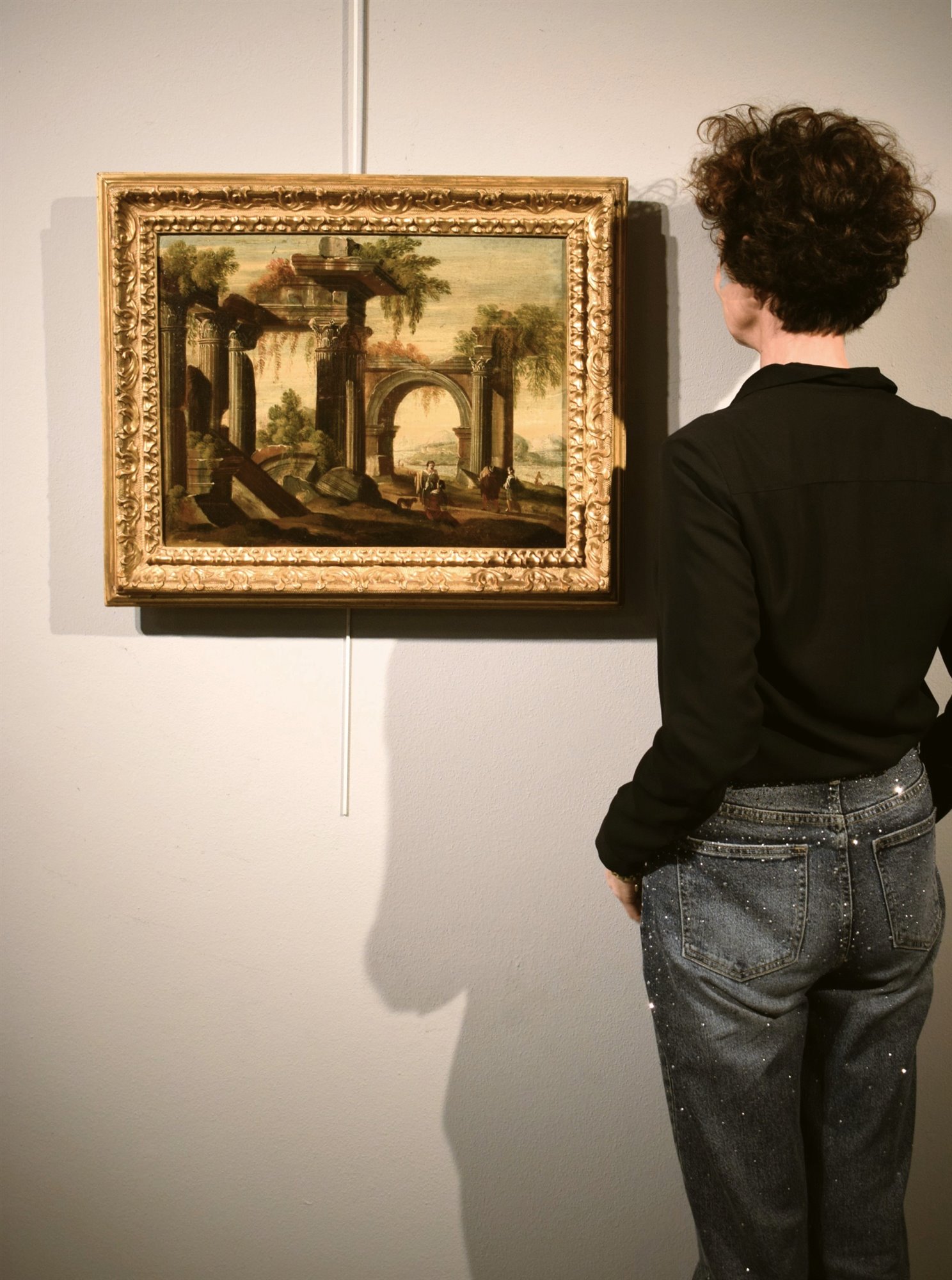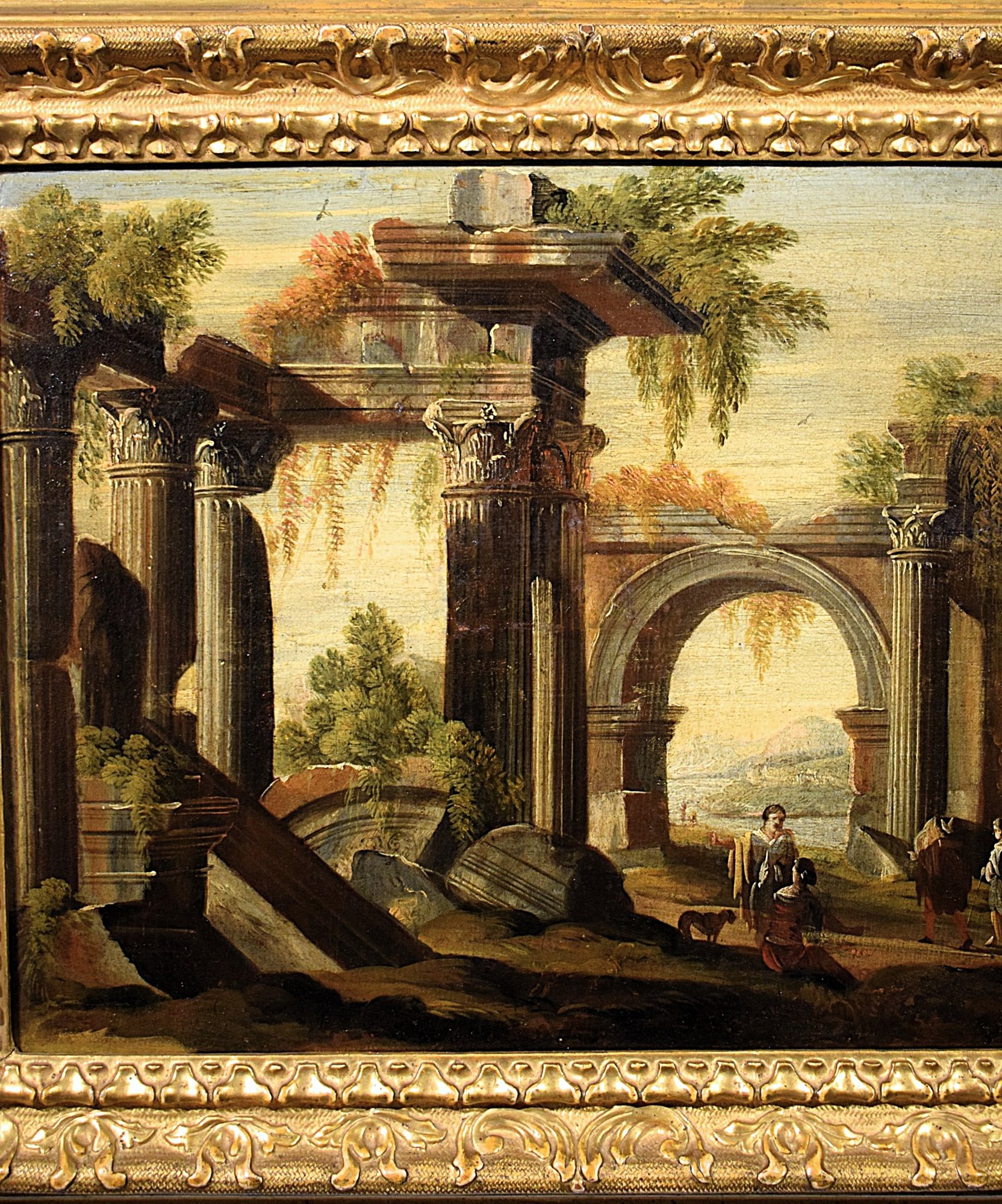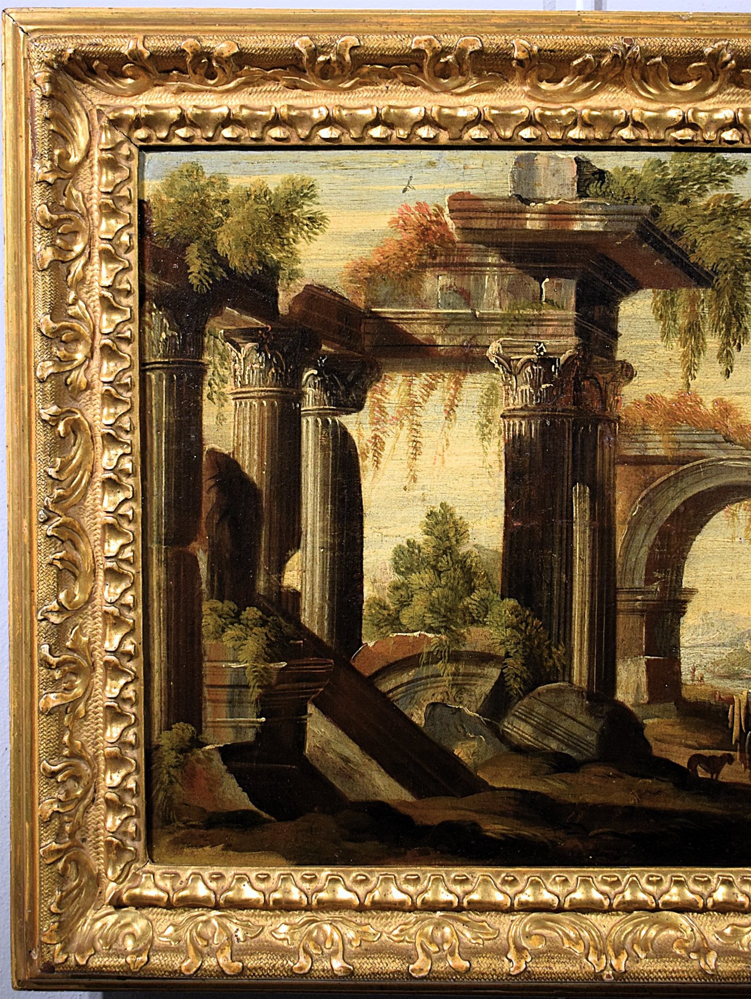 La toile représente une magnifique composition de ruines architecturales, exécutée dans le style pictural typique du paysagiste napolitain Leonardo Coccorante, spécialiste des œuvres de grand format sur ce sujet.