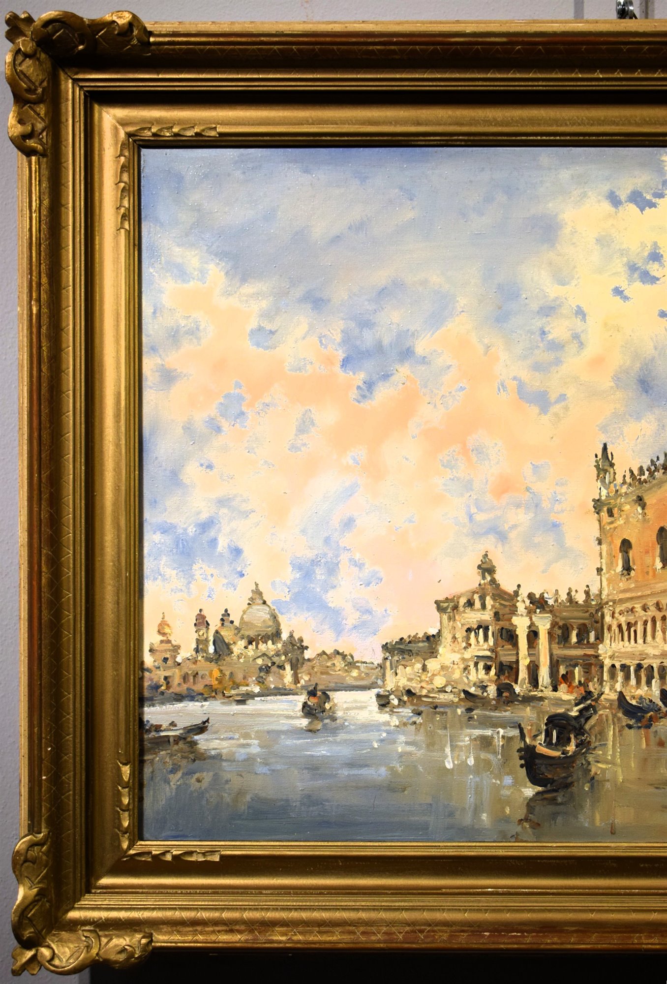 À l'arrière-plan, l'entrée du Grand Canal se dessine, avec les silhouettes de la basilique Santa Maria della Salute et de la Dogana.