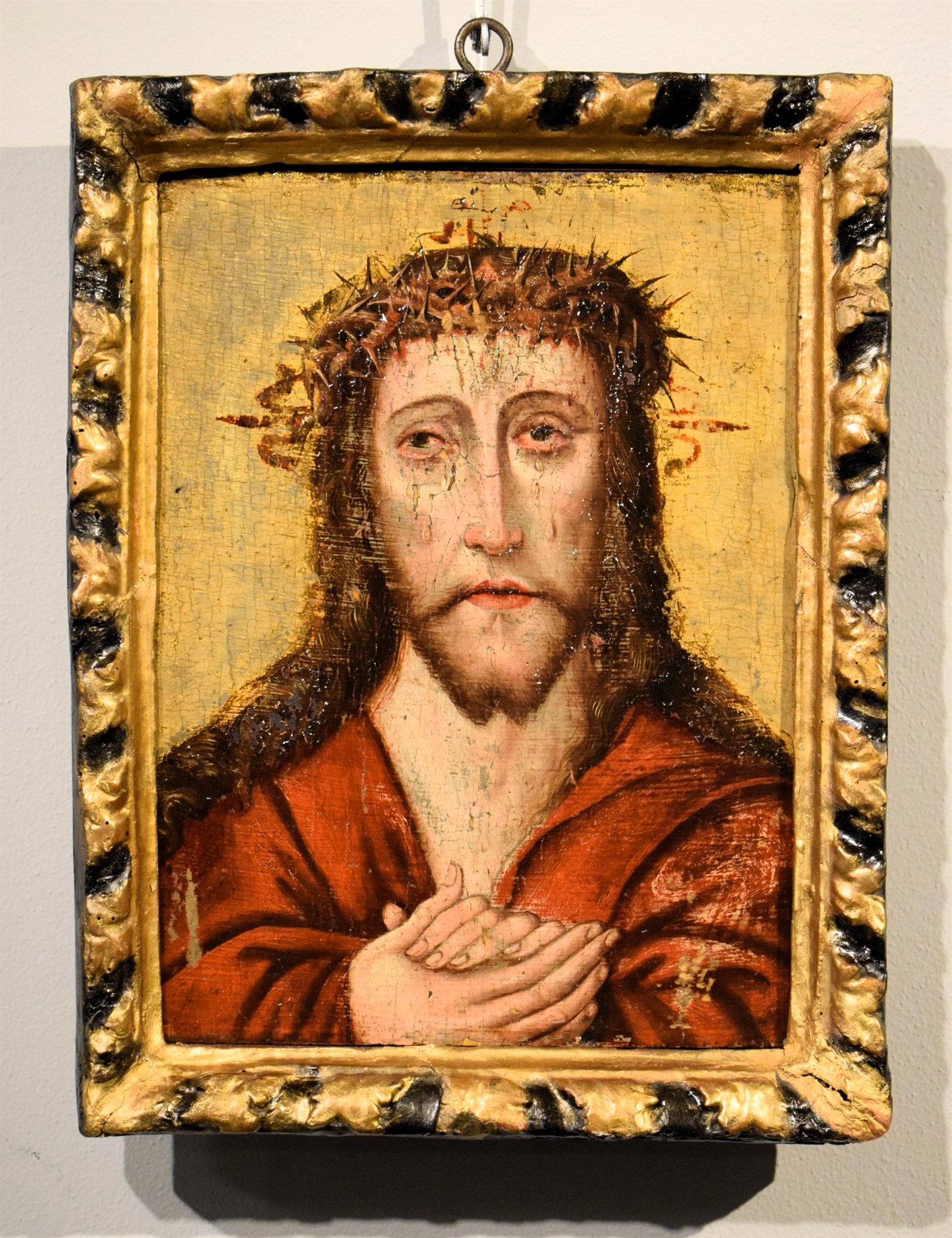 Dipinto su tavola raffigurante il volto di Cristo sfigurato dalla sofferenza, con il capo coronato di spine nella più tradizionale immagine dell' "Ecce Homo".