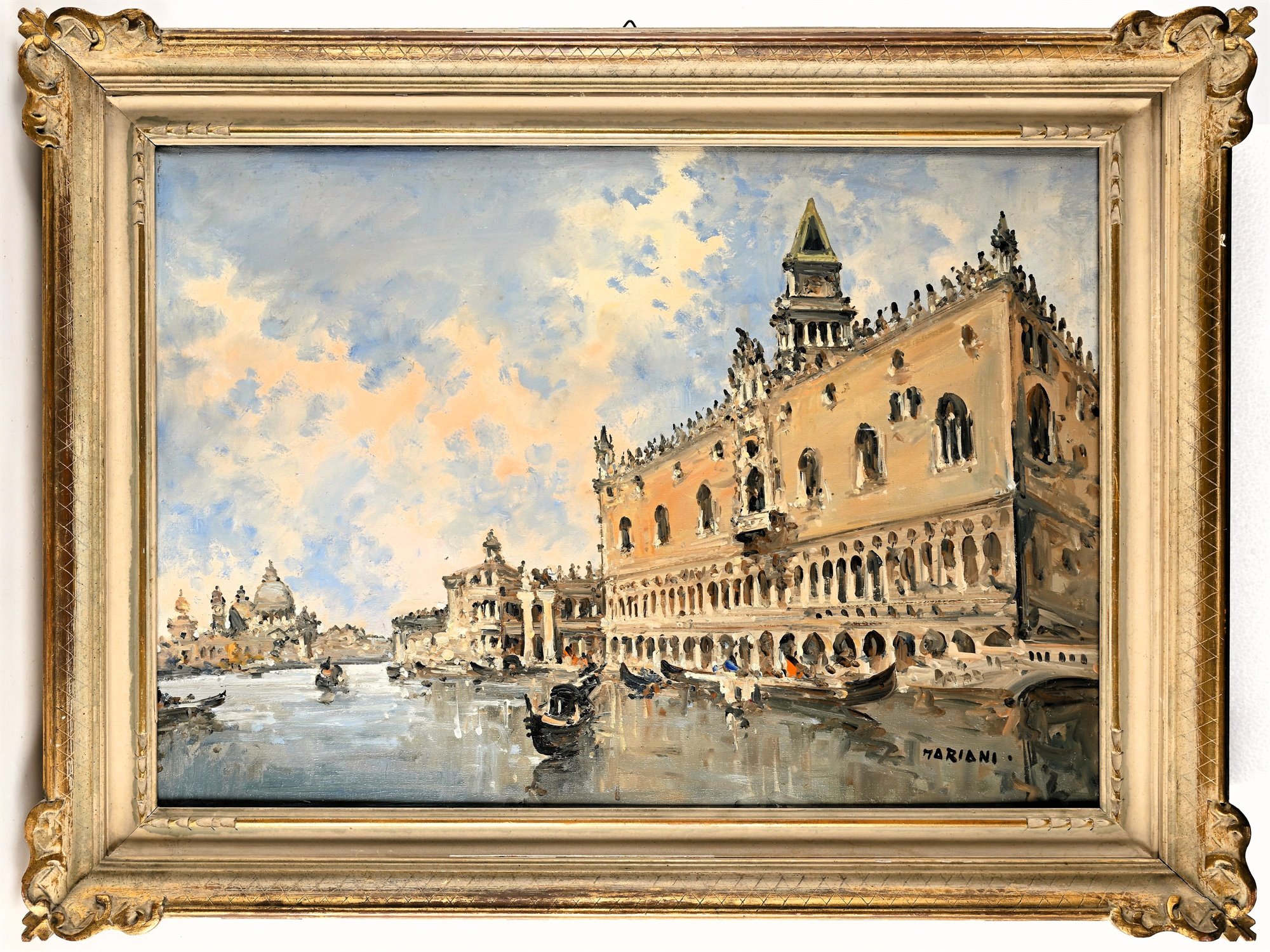La tela è completa della sua cornice originale in legno scolpito e laccato con profili in oro.
