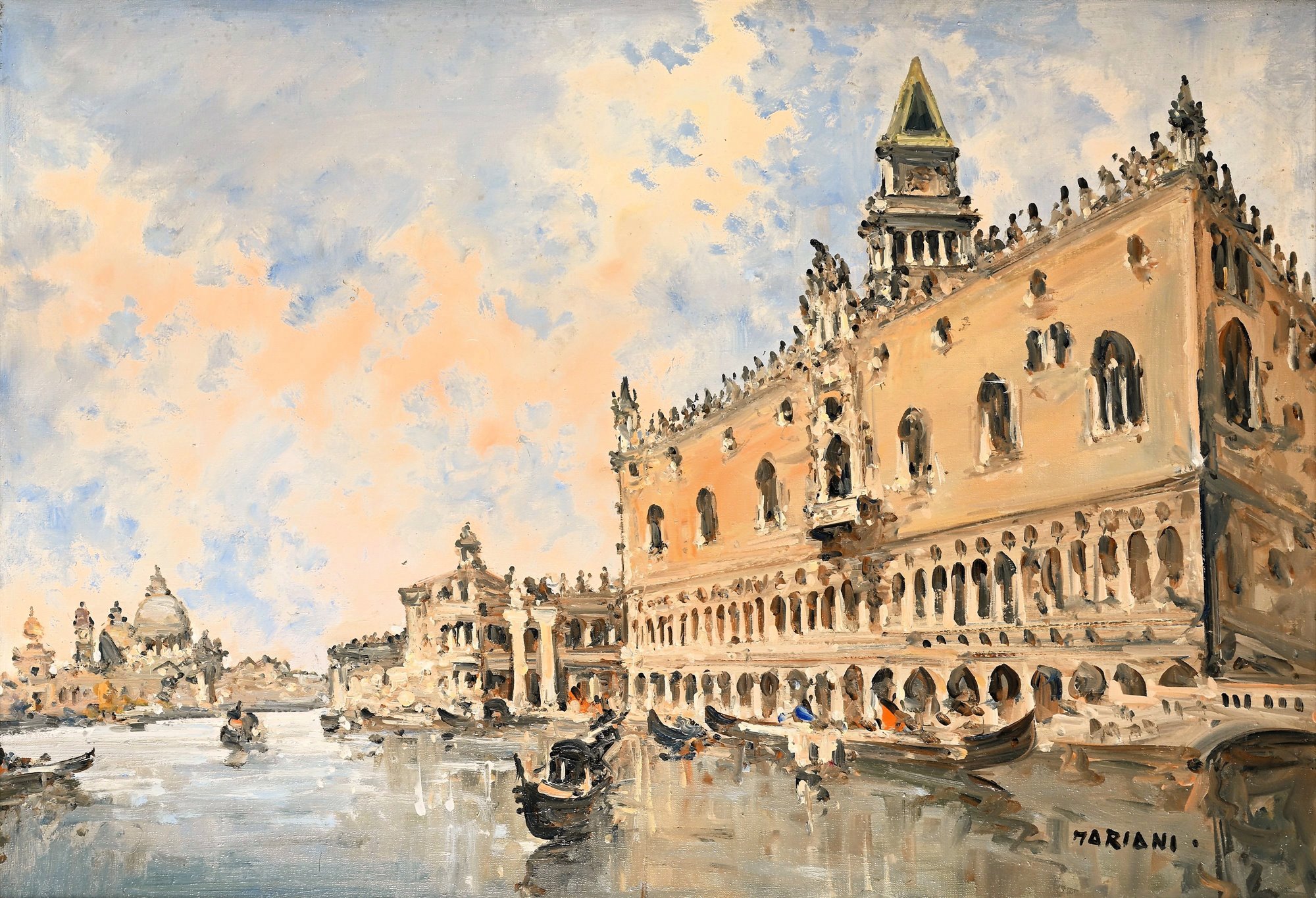 Sullo sfondo l'imbocco del Canal Grande con le sagome della basilica di Santa Maria della Salute e della Dogana.